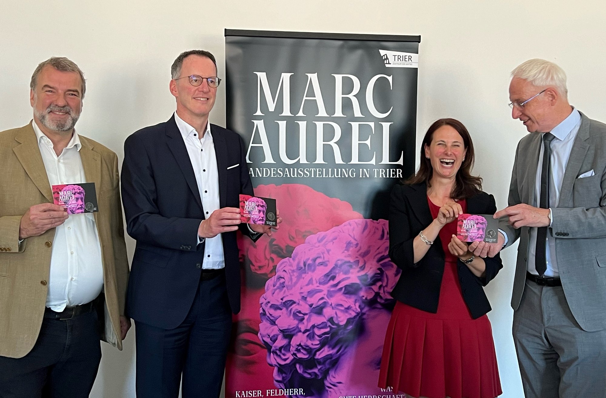 Die beiden Trierer Museen präsentieren vom 15. Juni bis 23. November 2025 die erste umfassende Schau zu Marc Aurel, der bis heute durch seine philosophischen Schriften nachwirkt. Innenminister Ebling und Oberbürgermeister Leibe präsentierten neben den Exponat-Highlights auch die Gestalter der Ausstellungsräume. Im Rheinischen Landesmuseum Trier kümmert sich das Atelier Hammerl & Dannenberg aus München um die Umsetzung, während sich das Büro Bach Dolder Katzkaiser aus Darmstadt der Gestaltung im Stadtmuseum Simeonstift widmet.