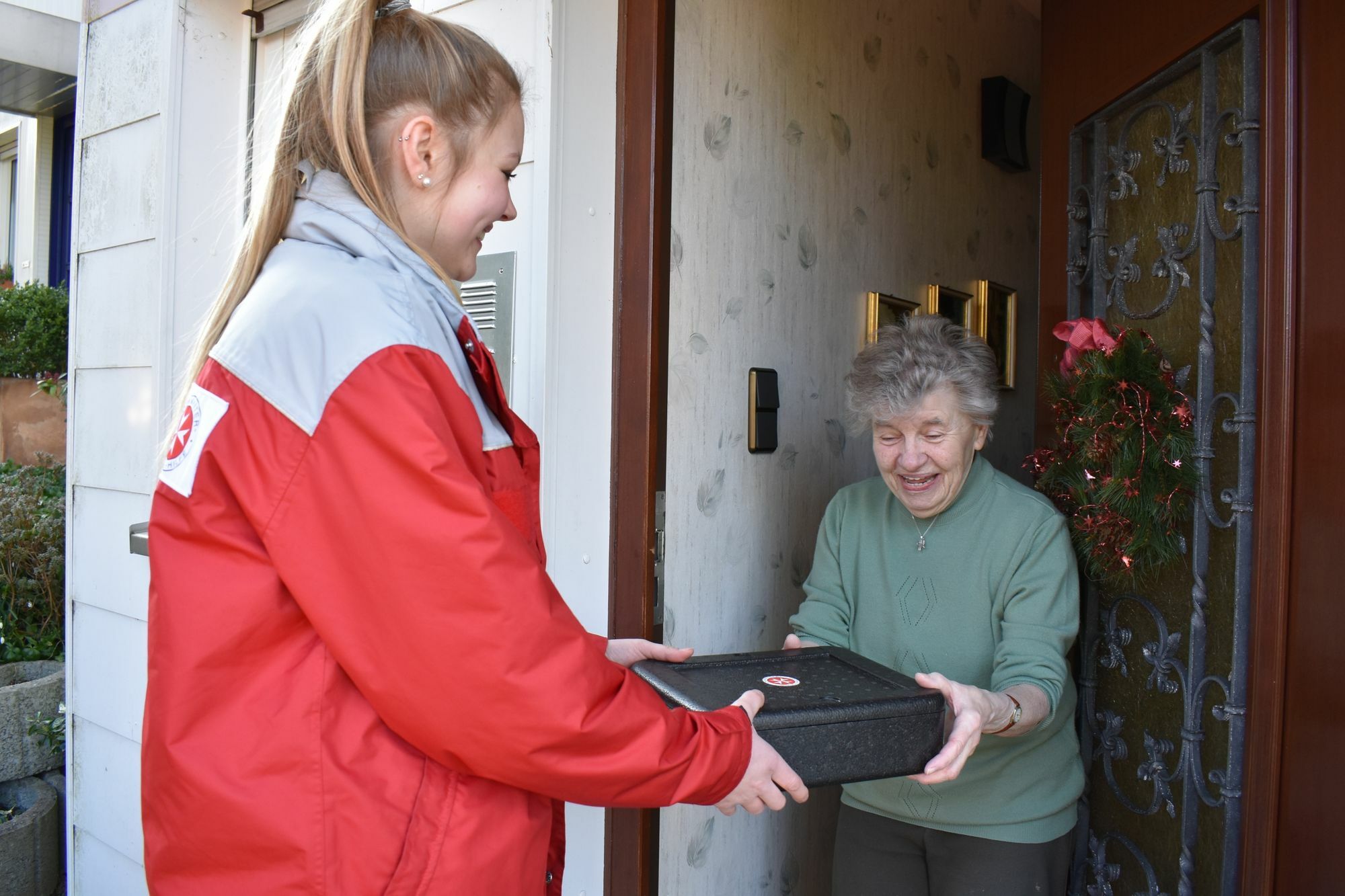 Heute gibt es Hühnertopf: Die langjährige Menüservice-Kundin Beate Günther (links) freut sich mit Felicia Feider von den Johannitern, die ihr dreimal wöchentlich die von der Deutschen Gesellschaft für Ernährung zertifizierten Gerichte vorbeibringt. Foto: Johanniter RV Trier-Mosel/ Regina Lüders