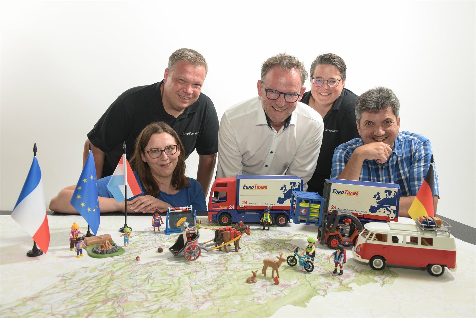Denn was die Pressestelle des Landes für das bald bevorstehende 75-jährige Landesjubiläum von ihm anforderte, das gab es zu dem Zeitpunkt noch gar nicht: ein Imagefilm des Landkreises. Was tun, fragte er sich und seine Kollegin Hannah Schmitz und die Antwort sollte Ihnen schon bald René Dumont geben. Der Trierer Medienunternehmer hatte nämlich mit seiner Filmproduktions-Firma mediawork:x von allen angefragten Firmen die zündendste Idee. Und an dieser Stelle kommen die 2 qm und die Playmobilfiguren ins Spiel. Denn Dumont und seiner Mitarbeiterin Katharina Faoro war schnell klar geworden, dass man in der kurzen Zeit und bei winterlichen Wetterbedingungen keinen normalen Imagefilm realisieren konnten und verfielen beim gemeinsamen Brainstorming auf die grandiose Idee mit Symbolen zu arbeiten und den Filmort ins Studio zu verlegen. So schrumpften die 1100 km²-Fläche des Landkreises auf die 2m²-Fläche einer Landkarte und die Hauptdarsteller waren nicht Firmen und Menschen aus Fleisch und Blut, sondern weltberühmte Figuren, Fahrzeuge und Produkte aus Plastik.