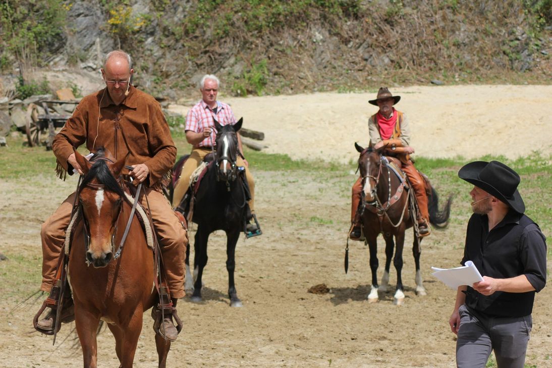 Marvin Scherf aus Hockweiler spielt Old Surehand, Ludwig Laros aus Trier und Rosi Thielen aus Bitburg seine Zieheltern. Während aus Ludwig Laros in der Rolle des Bankiers und Leos Vater das Familiengeheimnis heraussprudelt, unterbricht ihn Co-Regisseur Frank Lempges. Die »Eltern« sollen sich anders positionieren, sie beginnen wieder von vorne. Szenen immer wieder zu wiederholen, gehört zur Ablaufprobe.