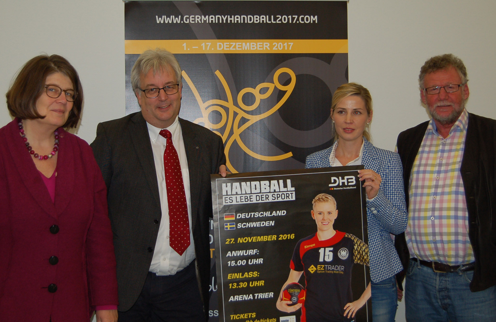 Werben für die Spiele der Frauenhandball-Weltmeisterschaft in Trier (von links): Bürgermeisterin Angelika Birk, Beigeordneter Andreas Ludwig, WM-Projektleiterin Julia Lewen und Arena-Geschäftsführer Wolfgang Esser. Foto: Arens