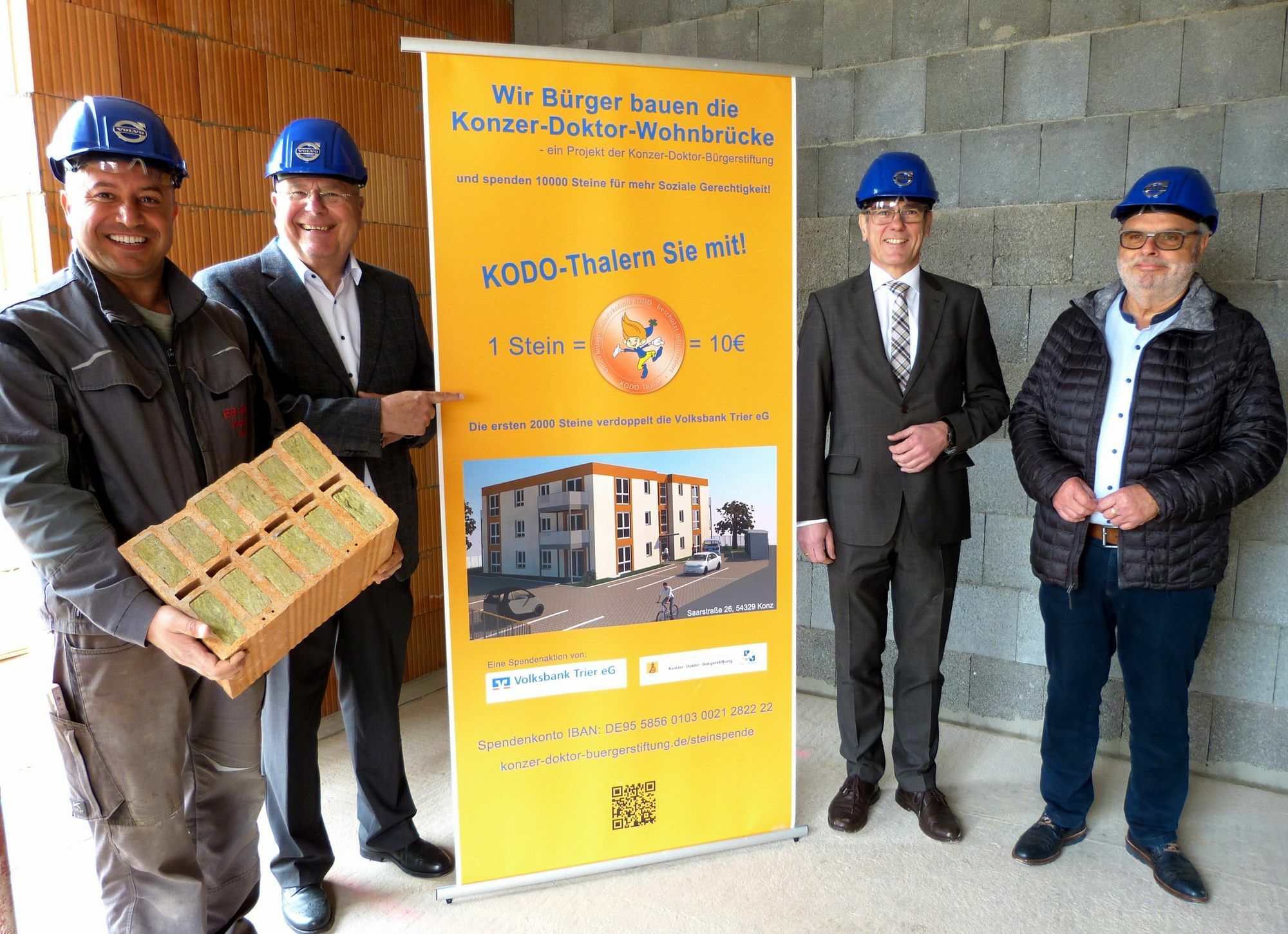 Der im November 2018 initiierte Steinspendenmarathon hat mit Stand 1. April ein Level von 1600 Steinen erreicht. Sobald die 2000er-Marke geknackt ist, verdoppelt sich die Anzahl der gespendeten Steine auf 4000, weil die Volksbank Trier e.G. dann weitere 2000 Steine für die Wohnbrücke spendet. Von dem Wunschziel - 10000 gespendete Steine für mehr soziale Gerechtigkeit - sei man auch dann noch ein großes Stück entfernt, weshalb Hartmut Schwiering an die Mitbürger appelliert: "Öffnen Sie Ihre Herzen und unterstützen Sie die Konzer-Doktor-Wohnbrücke mit einer Steinspende. Helfen Sie mit, dass bezahlbarer Wohnraum für einkommensschwächere Menschen in Konz langfristig zur Verfügung steht."