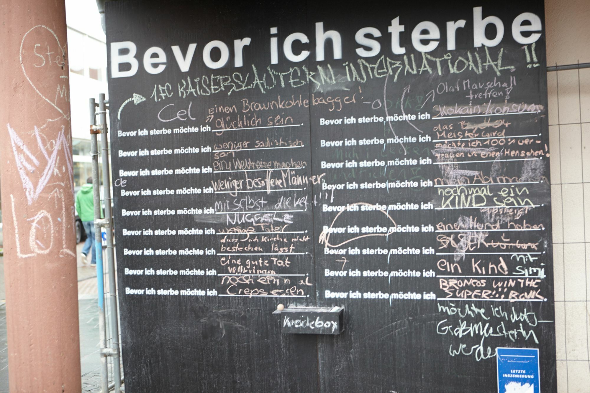 Bei der Aktion "bevor ich sterbe, möchte" können Passanten ihre Wünsche aufschreiben. Die Tafeln werden am Kornmarkt und der Uni Trier aufgestellt. Foto: FF