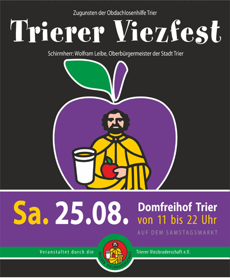 Unter der Schirmherrschaft von Oberbürgermeister Wolfram Leibe werden wieder mehrere Hundert Viezfreunde aus Trier und Umgebung erwartet, die bei deftigen Trierer Gerichten die Viezangebote von verschiedenen Herstellern aus der Region testen können. Natürlich gibt es auch wieder eine künstlerisch gestaltete Viezporz, diesmal mit einem Motiv der Trierer Künstlerin Lydia Oermann. Sogar eine "Welturaufführung" ist geplant: Wollen doch die Viezbrüder ihr eigens von Viezbruder Andreas Sittmann komponiertes "Viezbruderlied" erstmals zum Besten geben. Ihr Kommen zugesagt haben auch der Musikverein Irsch und die Bergmannskapelle Thomm. Und wer weiß, vielleicht wird zu seinem 200. Geburtstag auch Karl Marx den Festgästen seine Aufwartung machen ... FIN