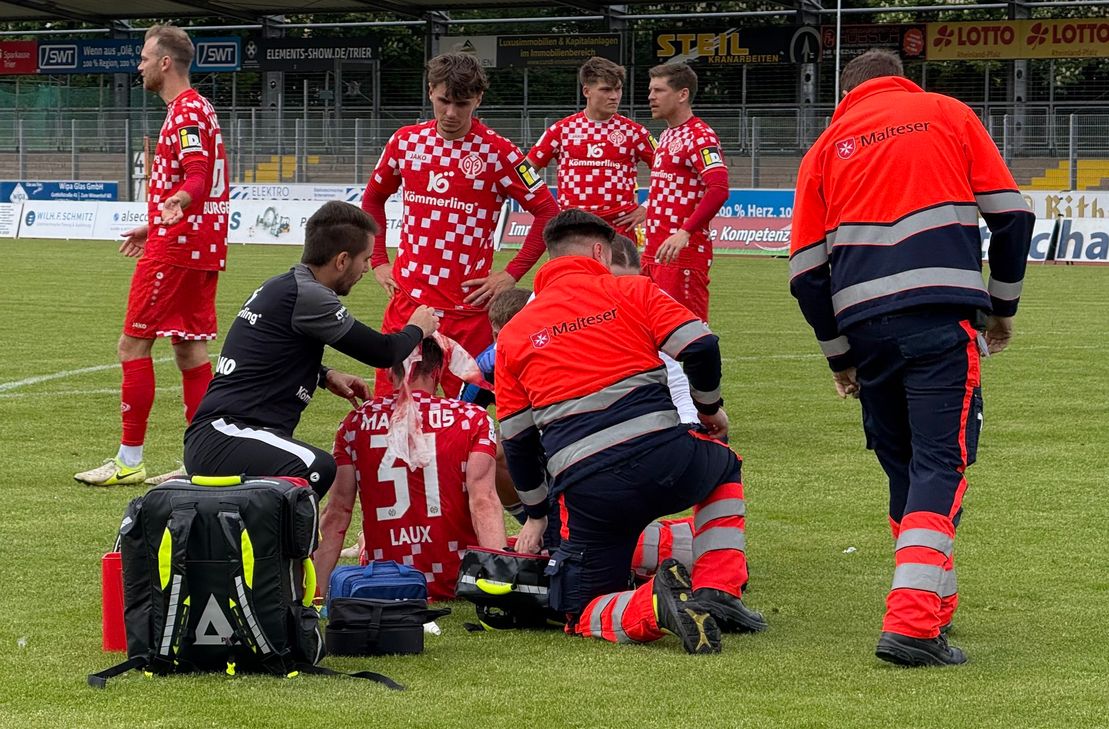 Doch dann der Schockmoment: In der 88. Minute prallte Lucas Laux bei einem Kopfballduell unglücklich mit einem Trierer Spieler zusammen. Laux blieb liegen, eine schwere Kopfverletzung mit starker Blutung wurde diagnostiziert. Beide Spieler mussten behandelt werden, der Mainzer wurde rund 10 Minuten auf dem Feld versorgt. Der Rettungsdienst musste ebenfalls eingreifen. Nach etwa zehn Minuten Unterbrechung wurde das Spiel mit einem Eckball für Trier fortgesetzt.