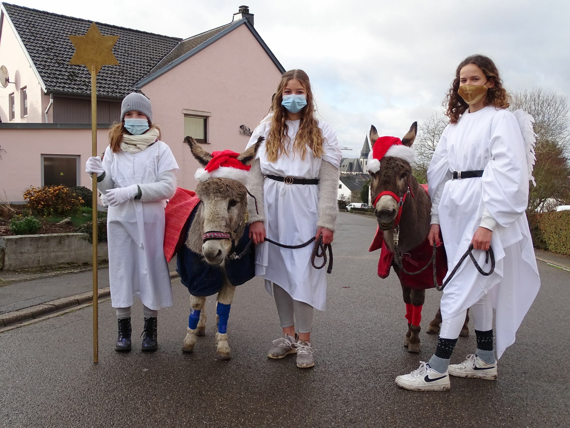 Corona hat das Jahr 2020 und auch das Weihnachtsfest bestimmt. Weihnachten, wie wir es sonst kennen, konnte nicht stattfinden. Besuche und liebgewonnene Bräuche mussten ausfallen. Deshalb hatten Sophie, Eva und Zoe aus Zemmer die Idee, ihren Mitmenschen eine Freude zu bereiten. Als Engel verkleidet und in Begleitung der Esel Leopold und Fränzis sind sie von Tür zu Tür gezogen, um süße Überraschungen an jeden Zemmerer Haushalt zu verteilen. Unterstützt von helfenden Händen hatten sie in der Vorweihnachtszeit eifrig an den Vorbereitungen für diese Aktion gearbeitet. Und ihre Mühe hat sich gelohnt. Wo immer die Gruppe als „mobiles Krippenspiel“ Station machte, zauberte sie ein Lächeln auf die Gesichter. Die Zemmerer Bürger haben die Initiative der drei Schülerinnen sehr positiv aufgenommen: Als ein Zeichen der Solidarität mit den Menschen, die in diesem Jahr anderen Menschen geholfen haben und als Zeichen der Nächstenliebe für diejenigen, die in diesem Jahr alleine Weihnachten feiern mussten.