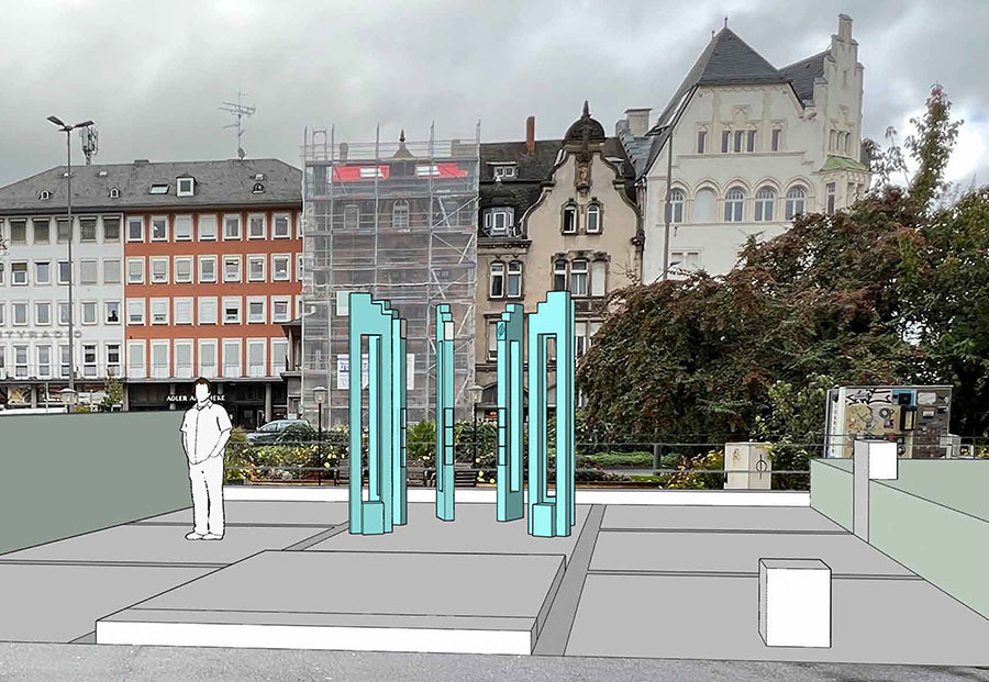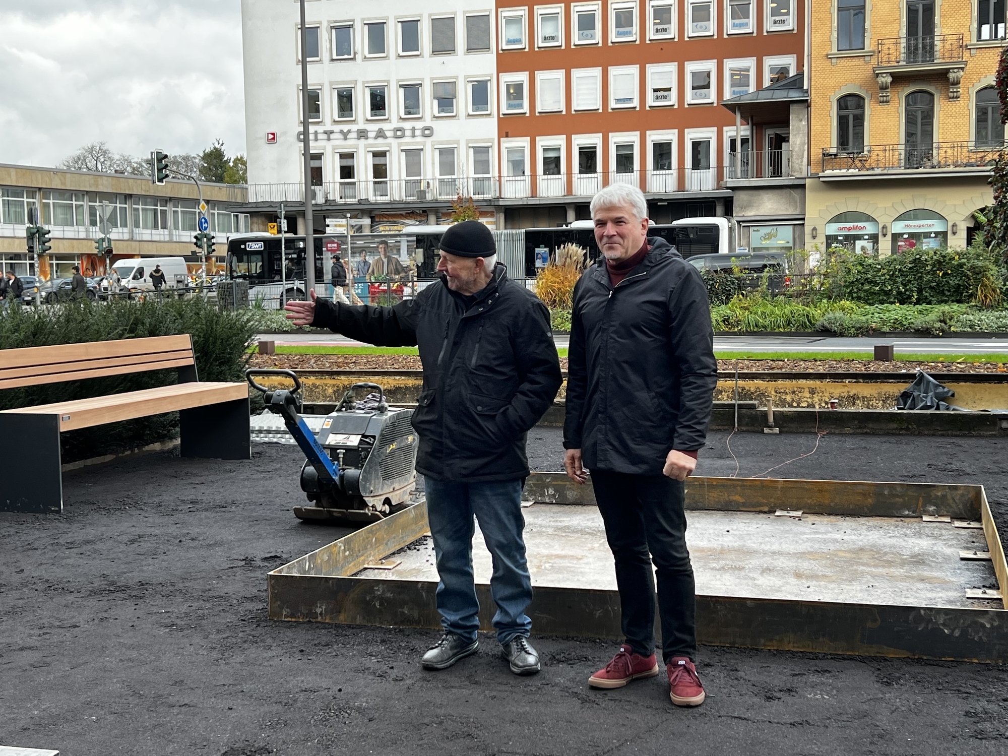Der zentrale Gedenkort entsteht derzeit unweit der Porta Nigra. Im Bild: Künstler Clas Steinmann und Landschaftsarchitekt Stefan Jacobs. Foto: Claudia Neumann