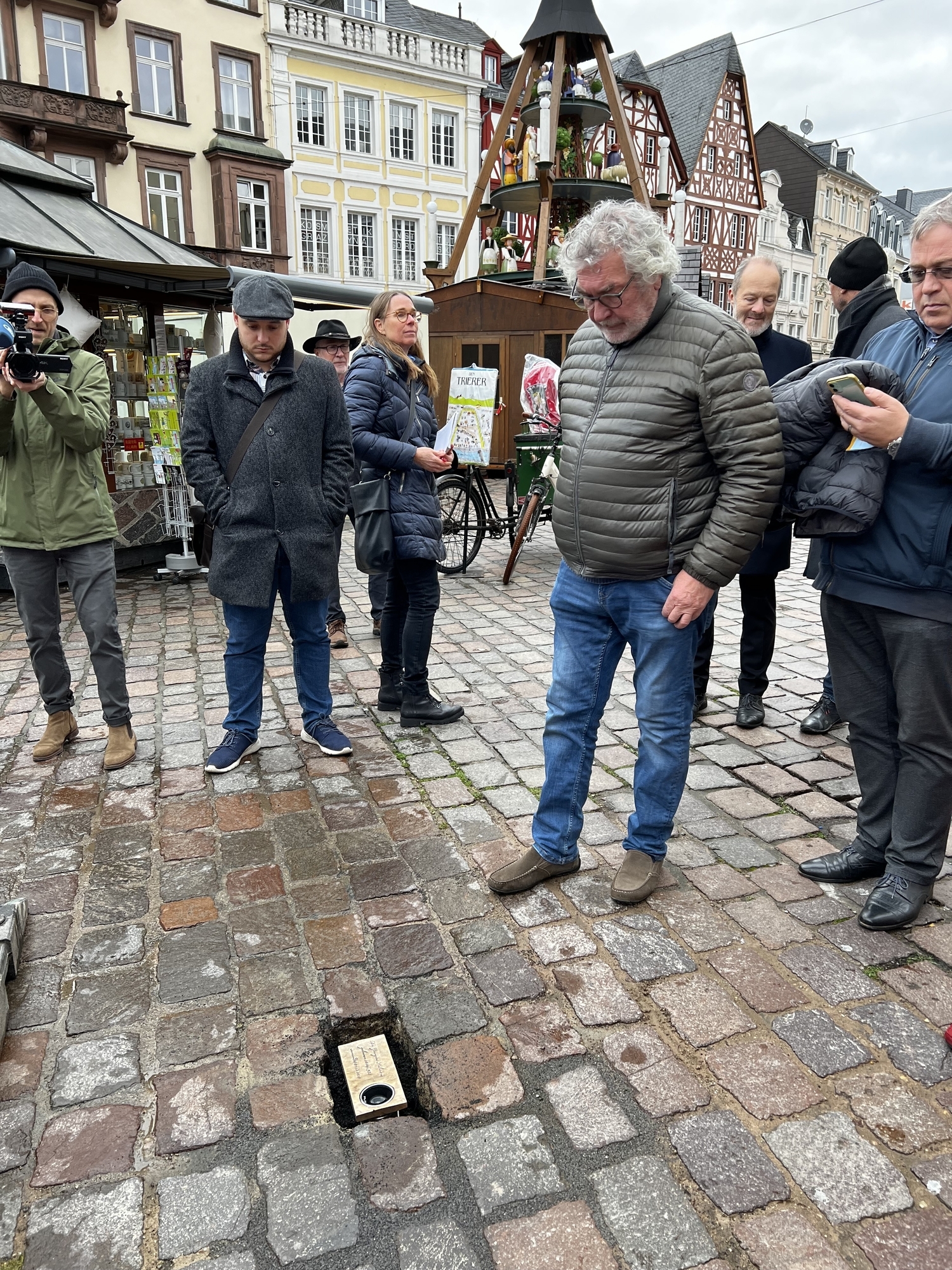 Guy Charlier (rechts) hat die Bronzeplaketten gestaltet. Auf dem Hauptmarkt erinnert nun eine davon an den hier bei der Amokfahrt ermordeten Dr. Georgios Kobiliris. Einge Meter weiter starb bei der noch immer unfassbaren Tat vor drei Jahren auch dessen erst wenige Wochen alte Tochter Virginia. Foto: Claudia Neumann