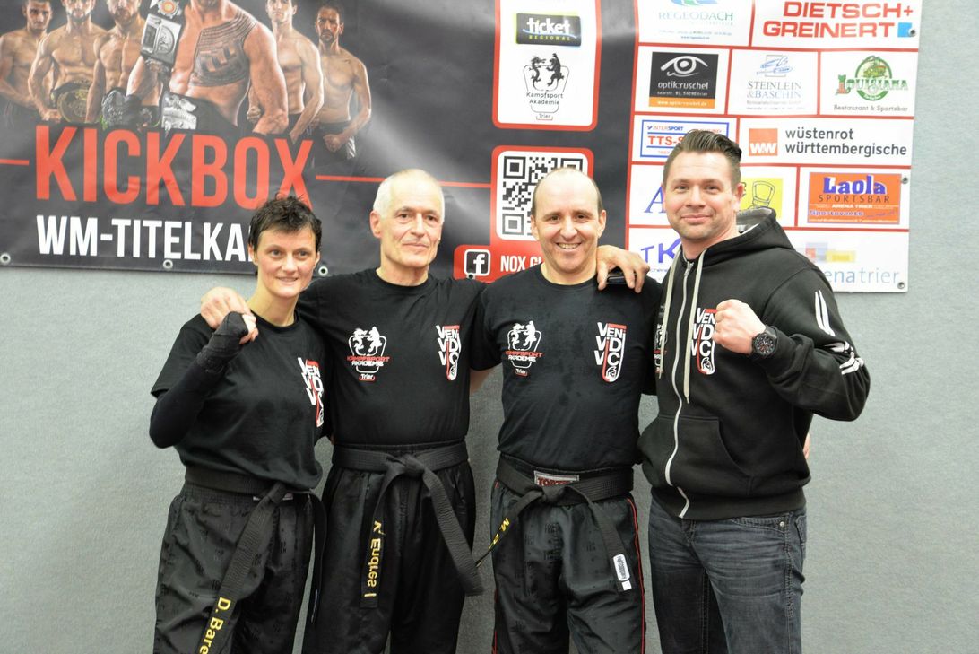 Für den Leiter der Kampfsport-Akademie Trier war der 6. März ein ganz besonderer Tag: zwei seiner Schüler, die sich 2012 als erstes in seiner neu gegründeten Akademie eingetragen haben, um die Wettkampfdisziplin "Kickboxen" zu erlernen, standen als Braungurt-Träger vor dem Schritt zum Meistergrad. Fast zweieinhalb Stunden Kampf mit stilistischen Aufforderungen der prüfenden Meister erfüllten den Raum. Die letzten drei 2-Minuten-Durchgänge waren wohl für alle Prüflinge die längsten und die härtesten. - Man konnte das Nachlassen der Kraft und der Konzentration direkt in den Bewegungen sehen. Doch ein jeder wollte das Ziel, den nächsten Gürtelgrad, erreichen. Danach entschieden die zwei prüfenden Meister. Außerhalb der Halle konnte man von zwei Kämpferinnen mit blauem Gurt erfahren, dass sie selbst Prüfungen im Alltag abnehmen würden. Heute und hier jedoch seien sie selbst betroffen und sie fühlten sich, als wäre es ihre erste Prüfung. Entspannung gab es zurück in der Halle der Kampfsport Akademie Trier in der Metternichstraße 39: Alle Prüflinge haben die Prüfung bestanden. Ganz besonders stolz sei Sascha Baschin auf seine drei Braungurt-Kämpfer, von denen zwei von ihm persönlich von Anfang an trainiert wurden. - Einen ganz besonderen Respekt auch gegenüber Volker Endres (der älteste Kämpfer im Raum), der mit 63 Jahren nun Schwarzgurt-Träger wurde. Auf unserem Titelfoto präsentieren sich die neuen Schwarzgurt-Kämpfer der Kampsport Akademie Trier mit ihrem Trainer (von links nach rechts): Daniela Bares, Volker Endres, Mario Bares und Sascha Baschin.