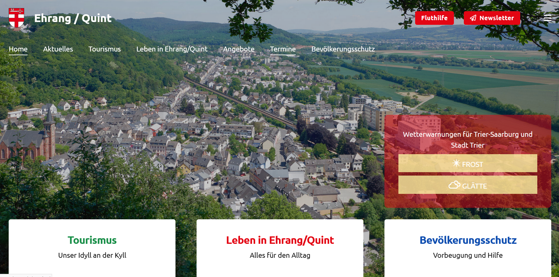 Ein zentraler Bestandteil der neuen Website ist der Bereich zu Fluthilfeangeboten und Bevölkerungsschutz. Diese Themen wurden besonders hervorgehoben, um den Bürgerinnen und Bürgern von Ehrang und Quint wichtige Informationen in Krisensituationen schnell und übersichtlich bereitzustellen.