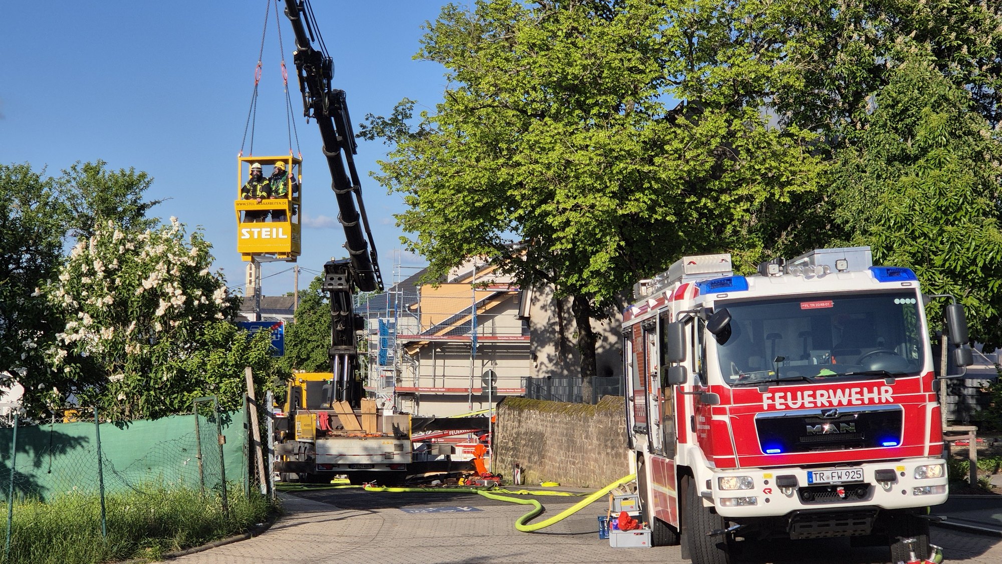 Die Kinder der in unmittelbarer Nähe liegenden Grundschule und des Kindergartens sind in Sicherheit. Wegen des Einsatzes kommt es zu Verkehrsbehinderungen in Feyen.