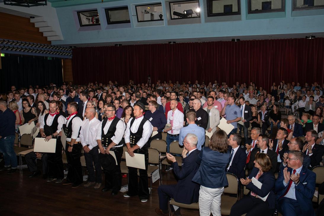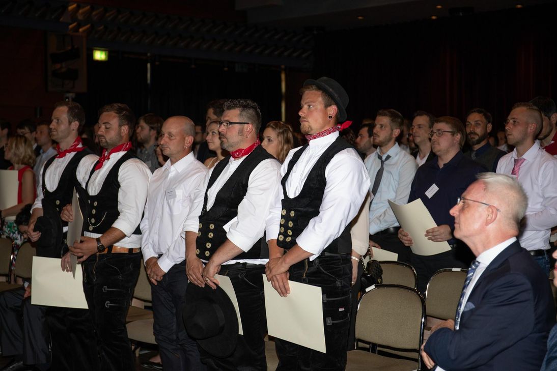 Das Handwerk der Region kann sich über diese hochqualifizierten Fachkräfte freuen: 37 Kraftfahrzeugtechniker, jeweils 16 Installateur- und Heizungsbauer sowie Friseure, jeweils 14 Elektrotechniker und Metallbauer, zwölf Maler und Lackierer, acht Feinwerkmechaniker, sieben Tischler, jeweils fünf Maurer und Betonbauer, Tischler und Zahntechniker sowie vier Zimmerer. Kammerpräsident Rudi Müller, Hauptgeschäftsführer Axel Bettendorf, der Trierer Oberbürgermeister Wolfram Leibe und HWK-Vollversammlungsmitglied Patrick Schnieder (MdB) sprachen in ihren Reden den jungen Meistern gegenüber Anerkennung und Respekt aus. OB Leibe sagte: "Ich beneide Handwerker darum, dass sie oft schon am Tagesende die Ergebnisse ihrer Arbeit vor Augen haben." Die Verwaltung hingegen arbeite in längerfristigen Prozessen. Stolz hielten alle Absolventen ihre Meisterbriefe in den Händen, als sie das Publikum auf der Bühne und im Saal mit der Fußballhymne "Auf uns" hochleben ließ. Der emotionalste und zugleich feierlichste Moment krönte die Zeremonie: die Einschwörung. Dazu erhoben sich die Jungmeister von ihren Plätzen. Was es über den tagtäglichen Problemlöser hinaus bedeutet, Meister zu sein, fasste der Kammerpräsident zusammen: »Vorbild als Mensch, Meister und Bürger zu sein sowie gesellschaftliche und soziale Verantwortung zu übernehmen«, sagte Müller. Patrick Schnieder betonte, dass der Wert der beruflichen Bildung noch stärker ins Bewusstsein rücken müsse. Sie sei so viel wert wie ein akademischer Abschluss. "Mit dem Meistertitel haben Sie die Spitze erreicht und tragen dazu bei, dass die Qualität und das Ansehen des deutschen Handwerks erhalten bleiben." RED, Fotos: Valentin-Kleinmann