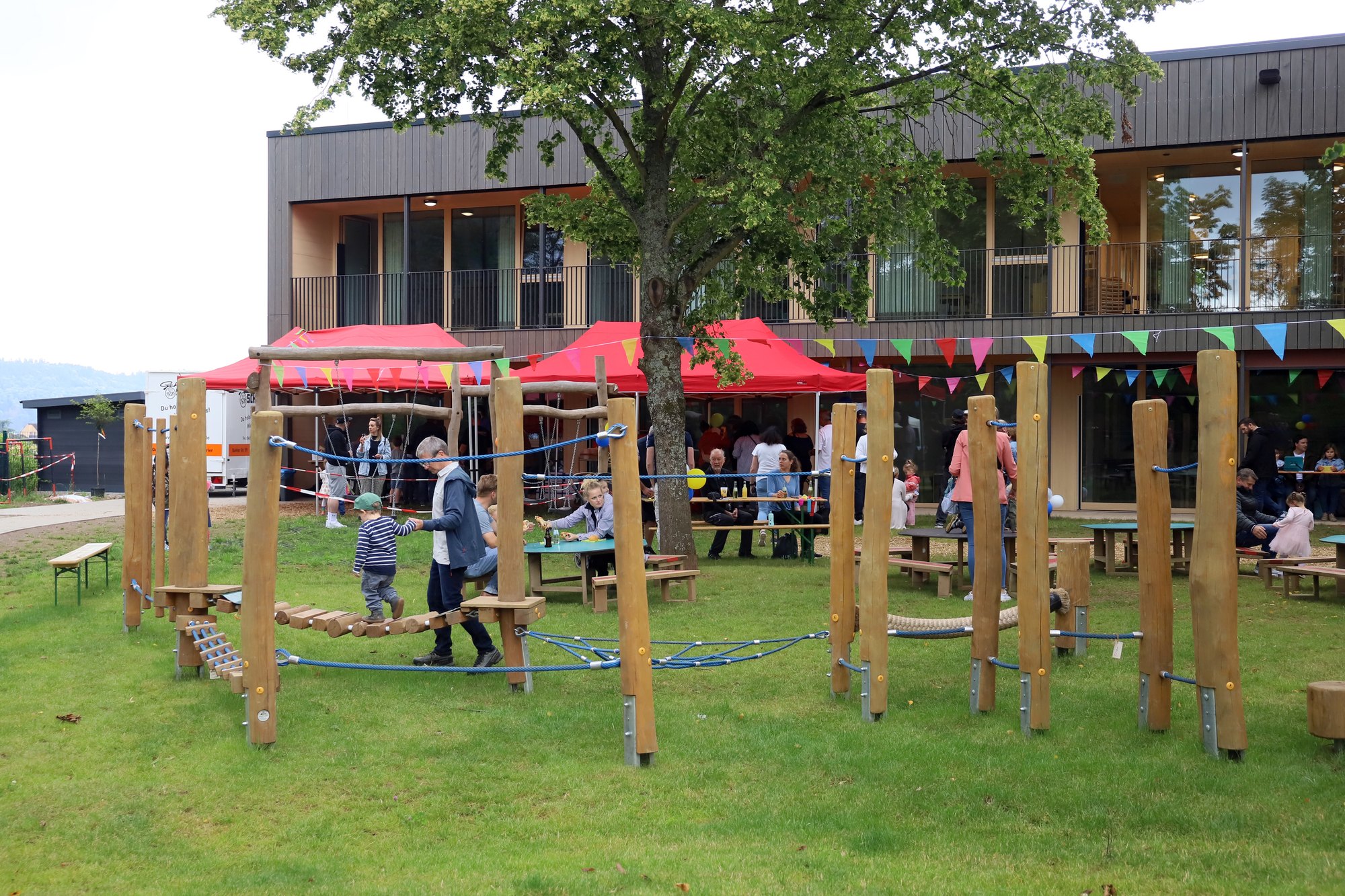Den kindgerechten Gottesdienst mit Pfarrer Klaus Stankowitz feierten die Gäste neben Rutsche und Klettergerüst auf dem weitläufigen Außengelände am Südhang hinter der Kita. Stankowitz setzte sich auf die großen Quadersteine zu den Kindern und erklärte ihnen anhand von kleinen Pflanzensamen, dass aus "klitzekleinen Dingen Großes entstehen" könne. "So wie aus einem kleinen Samen mit Sonne, Wasser und Erde mal ein großer Baum wird, so wurde auch eure Kita Schritt für Schritt von vielen fleißigen Menschen zu diesem tollen Gebäude zusammengebaut, das ihr jetzt vor euch seht", vermittelte Stankowitz den Kindern. Während des Gottesdienstes wurde ein von mehreren beteiligten Akteuren geschenkter Baum eingepflanzt, dem die Kinder mit etwas Hilfe des Pfarrers schaufelweise Erde beigeben durften. Während der anschließenden Begrüßungsreden erinnerte sich die damalige Standortleiterin und heutige Gesamtleitung Trier, Nina Wallrich, an die Ereignisse, die 2015 zur Schließung und letztlich zum Abriss des alten Kitagebäudes führten. "Ein Gutachten hatte eine zu hohe Belastung des Gebäudes von 1962 mit Schimmelsporen bestätigt. Danach überschlugen sich die Ereignisse." Die Kita schloss ihre Türen, die Kinder mussten an alternativen Standorten betreut werden. Schnell fand man in der ehemaligen Kita in Waldrach einen Ausweichstandort; später kamen bedingt durch die veränderten Anforderungen während der Corona-Pandemie eigens aufgestellte Container neben der Grundschule Ruwer hinzu. Eine Sanierung des Altbaus erwies sich als zu kostspielig, gerade mit Blick auf die veränderten energetischen Anforderungen. Während das alte Gebäude abgerissen wurde, konnte ein 2010 aus Platzmangel entstandener Anbau jedoch erhalten und integriert werden.