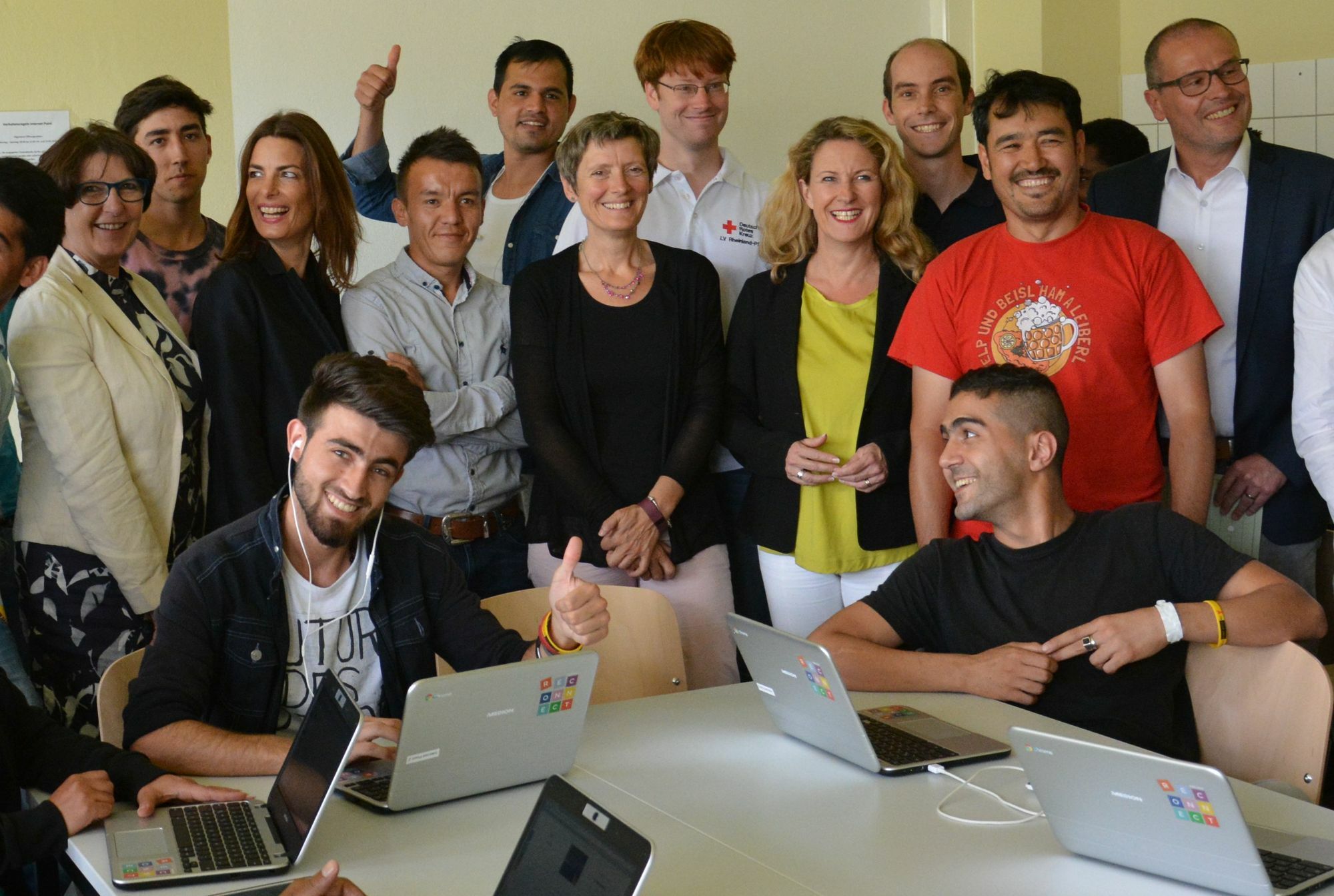 Wir freuen uns, dass das DRK in Hermeskeil und andere gemeinnützige Organisationen in Deutschland durch das ´Project Reconnect´ einen Beitrag hierzu leisten können.” Raab und Kroeber-Riel besichtigten die Aufnahmeeinrichtung und sprachen mit Asylbewerbern, die ihnen die Chromebooks vorführten. Die stellvertretende Geschäftsführerin des DRK-Landesverbandes, Anke Marzi, betonte: „Die Chromebooks sind für unsere Bewohner ein ideales Medium, um nicht nur die Sprache besser zu erlernen oder zu vertiefen, sondern auch um ihr Wissen zu erweitern. Während ihrer Fluchtzeit waren unsere Bewohner häufig nur über Handy und Internet mit ihren Familien verbunden. Demzufolge gibt es eine große Offenheit, sich nun über die Laptops auf ihr Leben in Deutschland vorzubereiten. Was beispielsweise unsere ehrenamtlichen Sprachmittler an Wissen vermitteln, kann nun dank der Chromebooks vertieft, intensiviert und erweitert werden. So kann Integration besser gelingen." Auch Begoña Hermann, Vizepräsidentin der Aufsichts- und Dienstleistungsdirektion, die für das Land die Aufnahmeeinrichtungen betreibt, zeigte sich erfreut über die Spende: „Schon in der Erstaufnahmeeinrichtung beginnt Integration, nicht erst, wenn die schutzsuchenden Flüchtlinge in den Kommunen ankommen. Die Chromebooks erleichtern diese wichtigen ersten Schritte unser Land besser