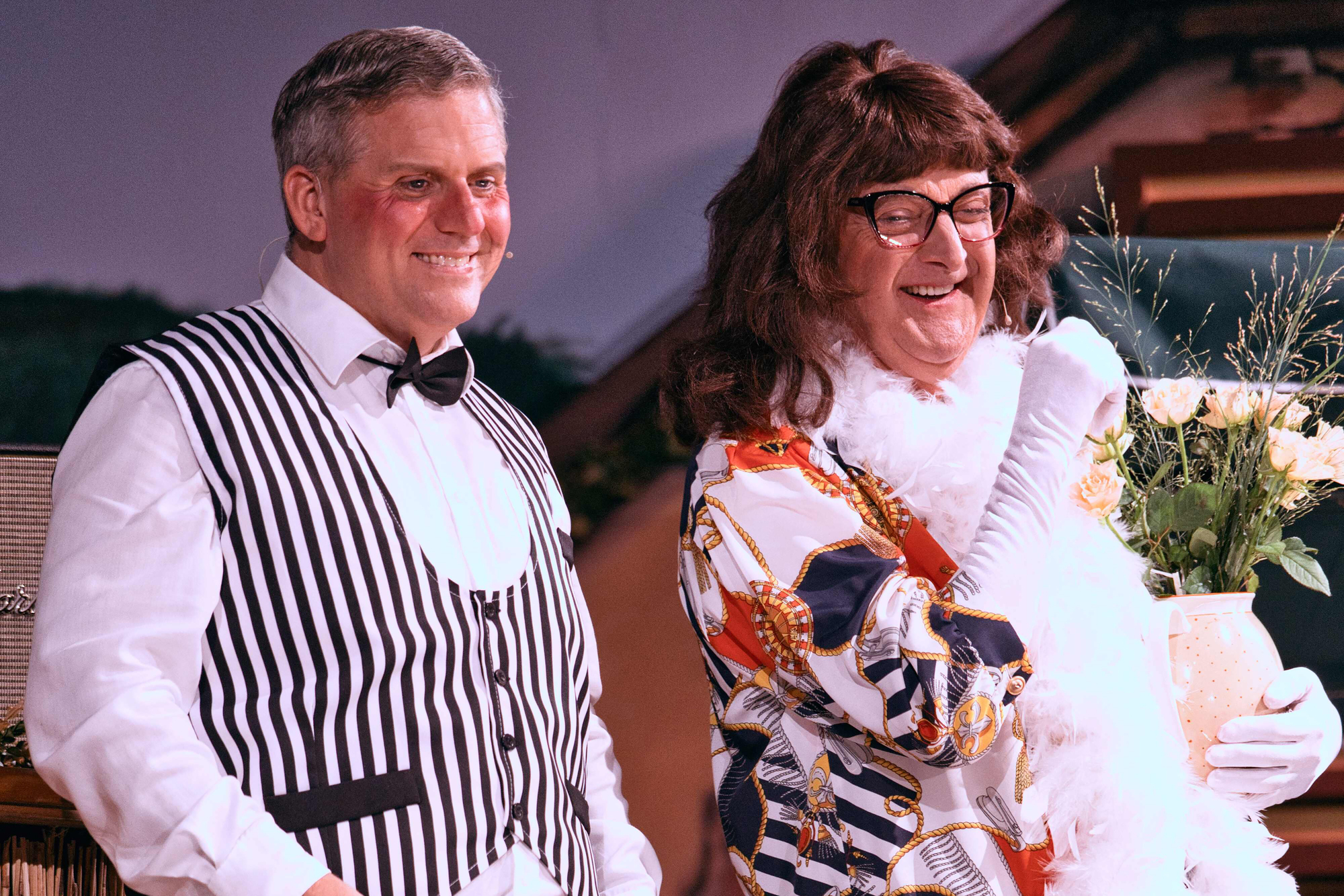 Extravagant wie eine Diva, mit Perücke und weißer Federboa, Kleid und langen weißen Satin-Handschuhen steht sie oben auf der Treppe, winkt mit nobler Geste allen zu, als wollte sie die ganze Welt umarmen. Der vorher nur herum geschubste Onkel Gabriel Grundhöfer (Jürgen Haubrich) becirct, täuscht und hilft in Herzensnöten bei seinem Auftritt als "Charleys Tante". Genau 131 Jahre nach der Uraufführung in England kommt sie nun wieder in heikler Liebesmission in der bekannten Komödie von Brandon Thomas, die in einer Bearbeitung von Maria Löw und Jürgen Haubrich am vergangenen Samstag (15. Oktober) flutbedingt in Trier-Biewer Premiere feierte.
