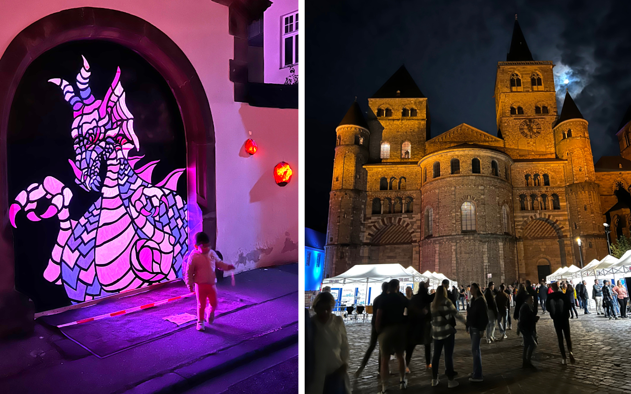 Ein weiteres Highlight war die begehbare Licht-Video-Installation auf dem Platz der Menschenwürde. Der Berliner Künstler Philipp Geist entwickelte mit "Time Drifts Trier" einen poetisch-malerischen Lichtraum mit Wörtern und Assoziationen rund um die Frage: "Was ist für Dich Licht in der Finsternis?" Diese Begriffe wurden in einen über den Platz wabernden Theaternebel projiziert, erschienen hell leuchtend in der Luft, auf dem Boden und sogar auf den Besucherinnen und Besuchern, die sich auf dem Platz bewegten.