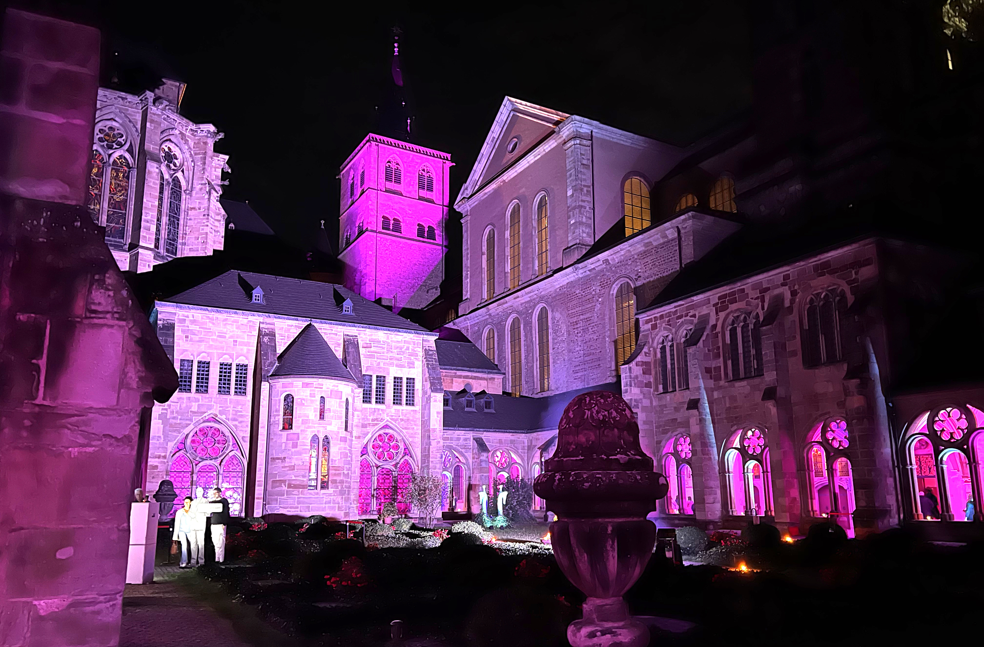 Ein besonderes Highlight war die Illumination des mittelalterlichen Kreuzgangs des Doms. Unter dem Titel "LUX AETERNA: Sehnsucht nach Licht" wurde der bereits bei Tageslicht kunsthistorisch bedeutsame Verbindungsweg zwischen Dom St. Peter und der hochgotischen Liebfrauenkirche zu einem stimmungsvolles Illuminationskunstwerk, das zu 100 Prozent klimaneutral zum Leuchten gebracht wurde.