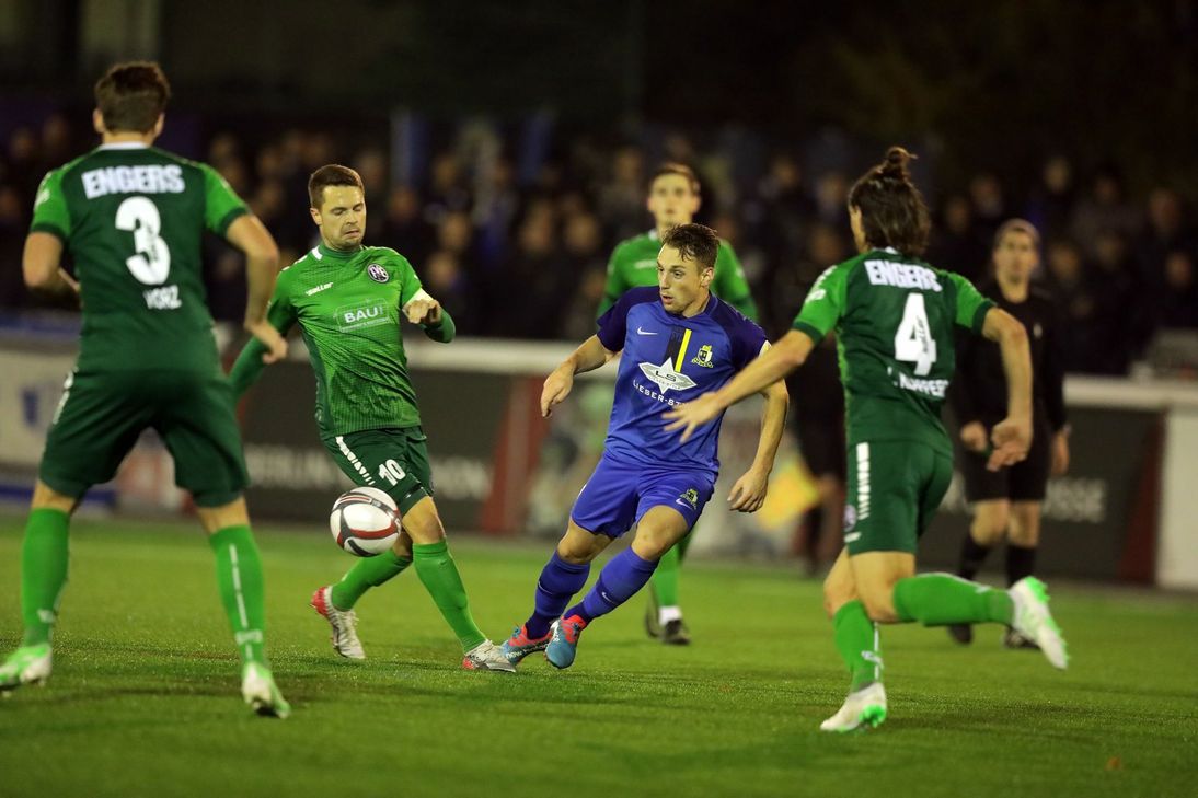 Schon vor dem Anpfiff der Partie gab es die erste schlechte Nachricht zu vermelden: Stammtorwart Denis Wieszolek fiel aufgrund eines Magen-Darm-Infekts kurzfristig aus, für ihn rückte Ersatzmann Hendrik Bitzer zwischen die Pfosten, der bereits beim Achtelfinal-Erfolg gegen die SG Ellscheid (2:0) den Kasten des SVE hütete. Zudem kehrte Jason Thayaparan in die Startelf zurück, um gegen die Hausherren mehr Stabilität im Defensivverbund zu erreichen. Tim Garnier nahm daher zunächst auf der Bank Platz. Die Gastgeber aus dem Neuwieder Stadtteil, sie kamen besser in die Partie, wirkten in der Anfangsphase griffiger und passsicherer als die Eintracht – jedoch ohne wirkliche Torgefahr auszustrahlen. So wunderte es nicht, dass es einiger Einzelaktionen bedarf, um die ersten Offensivaktionen der Blau-Schwarz-Weißen zu initiieren: Leonel Brodersen setzte sich gegen drei Verteidiger auf dem Flügel durch – doch Kinschers Fernschuss war in der Folge eine Etage zu hoch angesetzt (10.). Besser machte es da der mit aufgerückte Sanoussy Balde, dessen Abschluss FVE-Schlussmann Djordjevic aus dem Winkel kratzte (19.). Es entwickelte sich eine Partie im Mittelfeld, in der Torchancen Mangelware bleiben sollten – Noel Schlesiger zirkelte eine Flanke auf den torgefährlichen Klappert, aber Eintracht-Kapitän Maurer klärte in höchster Not (35.), ebenso wie sein Kollege auf Seiten der Hausherren, Marcel Horz – doch seine Rettungsaktion kurz vor der Pause gegen Kling sorgte für Aufregung, zog er im Zweikampf doch das Standbein des passbereiten Kling weg, doch der Pfiff von Schiedsrichter Kreutz blieb trotz zahlreicher Proteste aus. Ohne Wechsel auf beiden Seiten begann die zweite Hälfte, die zunächst schon wieder die Hausherren im Vorteil sah: Sinanovic mit einem Rückpass in die Beine von Klappert, der knapp verzieht – die beste Gelegenheit in der gesamten Partie bis hier hin (54.), allerdings direkt gefolgt vom Engerser Führungstreffer, den Jonathan Kap per Kopfball-Bogenlampe nach Freistoß von der Mittellinie über Bitzer hob und zum 1:0 verwandelte (55.) – ein vermeidbarer Treffer. Cinar nahm zwar Heinz für Sinanovic in die Partie, um über die Flügel mehr Laufkraft zu erzeugen, doch herausgespielte Torgefahr vor dem Heim-Tor wollte sich partout nicht entwickeln. Im Gegenteil: es reichten – wie beim 1:0 – einfachste Mittel, um dem SVE weh zu tun: wieder eine lang geschlagene Standardsituation, wieder eine Kopfball-Bogenlampe, dieses Mal nach Ecke, dieses Mal Klappert: das 2:0 für die Hausherren (73.). Auch personelle Überzahl sollte keine wirkliche Verbesserung bringen: Lukas Haubrich flog wegen wiederholten Foulspiels mit Gelb-Rot vom Platz (79.). Doch nur Minuten später sah auch der gerade erst eingewechselte Jonas Amberg glatt Rot, Kreutz ahndete ein Einsteigen von ihm gegen Djordjevic (81.). Danach sollte nicht mehr viel passieren und die Eintracht muss im Pokal erneut im Viertelfinale die Segel streichen. Eintracht-Trier: Bitzer - Brodersen, Kling, Maurer, Kaluanga – Thayaparan, Balde (ab 76. Amberg), Salem, Kinscher (ab 69. Garnier), Sinanovic (ab 63. Heinz) – Brandscheid. FV 07 Engers: Djordjevic – Stieffenhofer (ab 61. Hermann), Klappert, Horz, Fiege – Finkenbusch, Splettstößer, Schlesiger (ab 85. Andreaci), Haubrich – Kap, Klappert (ab 90. Kremer). Tore: 1:0 Kap (55.), 2:0 Klappert (73.) Gelb-Rot: Haubrich (77. / Engers) Rot: Amberg (81. / Trier) Schiedsrichter: Ingo Kreutz Fotos: Sebastian Schwarz