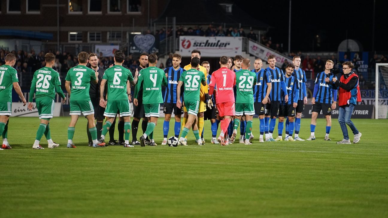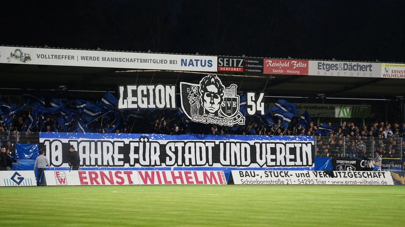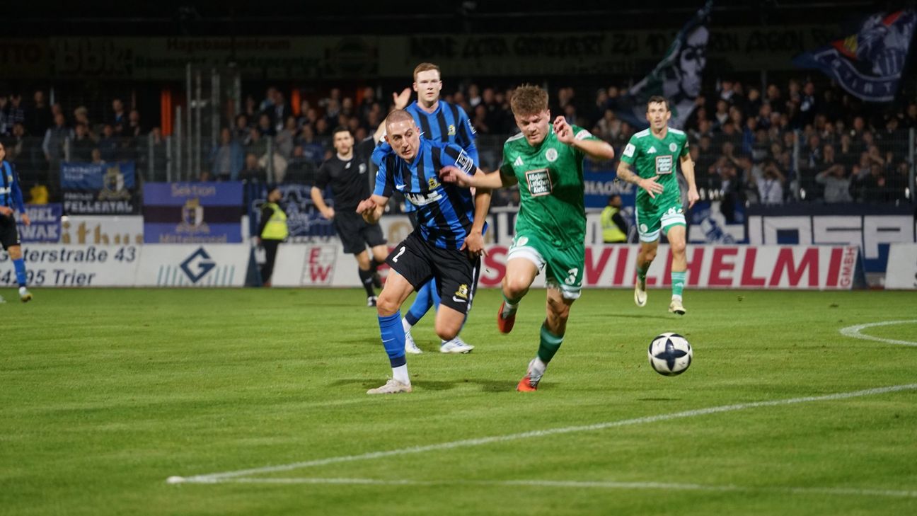 Zur Pause stand Trier verdient in Führung. Die Halbzeitbilanz spiegelte die Rivalität dieser Partie wider: engagierter Einsatz, taktische Umstellungen und vereinzelte Platzverweise blieben aus, doch die Intensität blieb hoch. Neben dem Geschehen auf dem Grün trug auch die Atmosphäre ihren Teil bei: Schon vor dem Anpfiff wurde außerhalb des Stadions ein kleines Feuerwerk zum Geburtstag der Fangruppe „Legion 54“ gezündet, dem eine Choreografie gewidmet war – ein stimmungsvolles Bild vor dem Flutlichtabend.