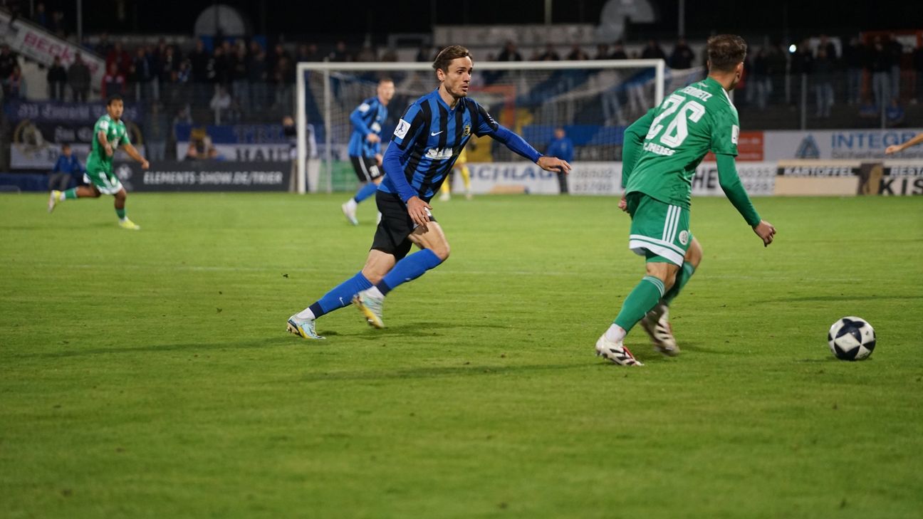 Die Partie begann rasant. Schon in der siebten Minute fiel die frühe Führung für Trier: Frederik Rahn nutzte eine Unaufmerksamkeit in der Homburger Hintermannschaft nach einer Hereingabe von Christopher Wähling und schob den Ball ins Netz – sein erster Saisontreffer sorgte sofort für ausgelassene Stimmung auf der Gegengerade. Die frühe Führung war ein Lohn für couragierte Anfangsminuten der Eintracht, die sich mutig in die Zweikämpfe warfen und das Tempo hochhielten.
