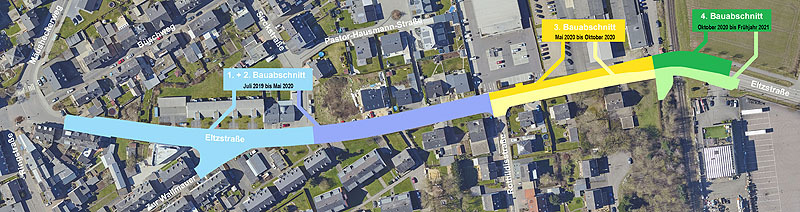 Der Ausbau der Eltzstraße beginnt am 29. Juli mit der Vollsperrung der ersten beiden Bauabschnitte. Betroffen sind der Bereich vom sogenannten "Pfalzeler Stern" über die Einmündung "Zur Wallmauer bis zur Rothildisstraße". Die Bauarbeiten in diesem Bereich werden voraussichtlich bis Frühjahr 2020 dauern.