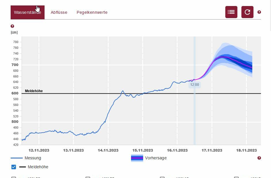 Die Wasserstandsvorhersagen sind aufgrund der großen Spanne der Niederschlagsvorhersagen noch unsicher.