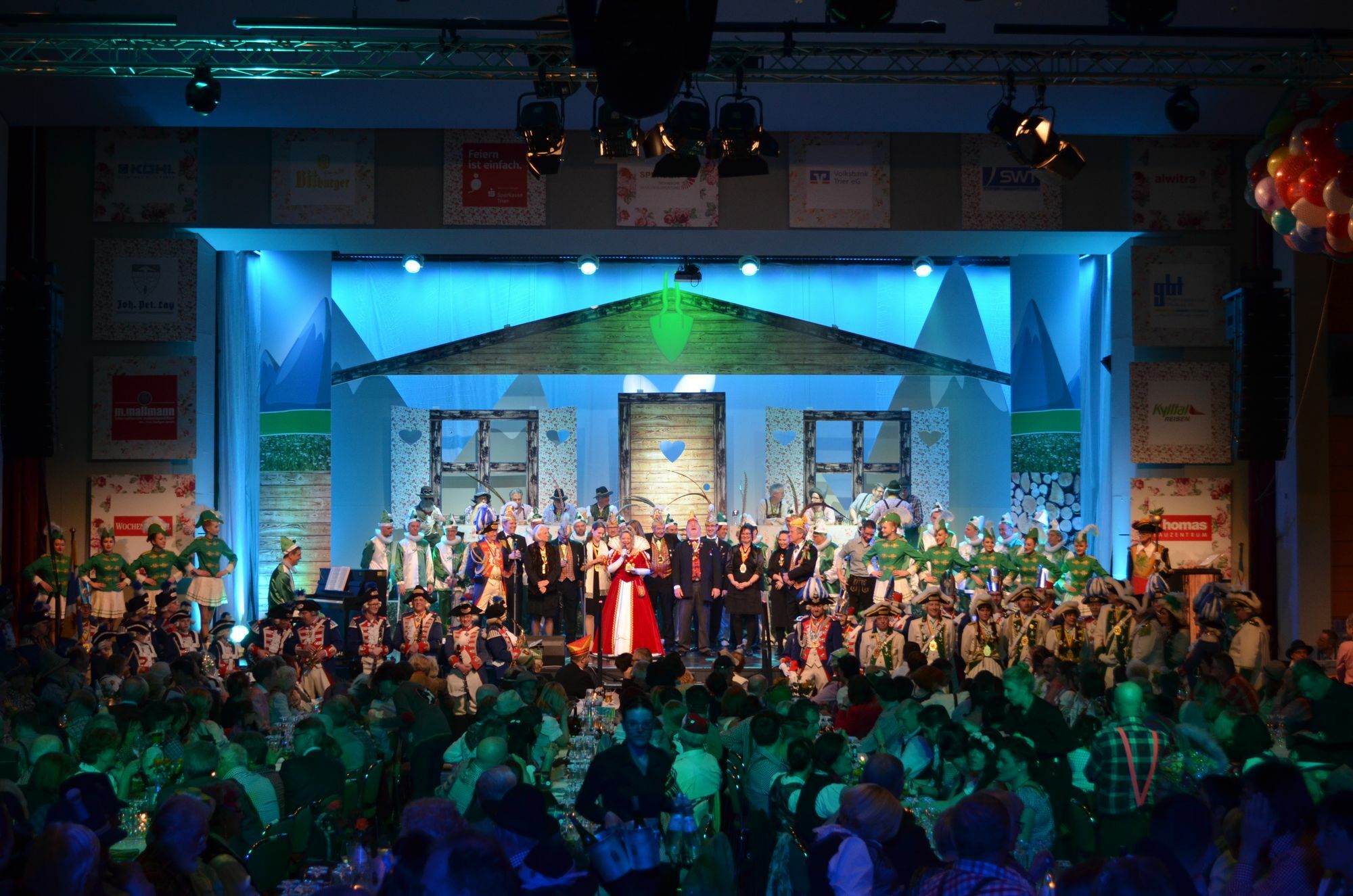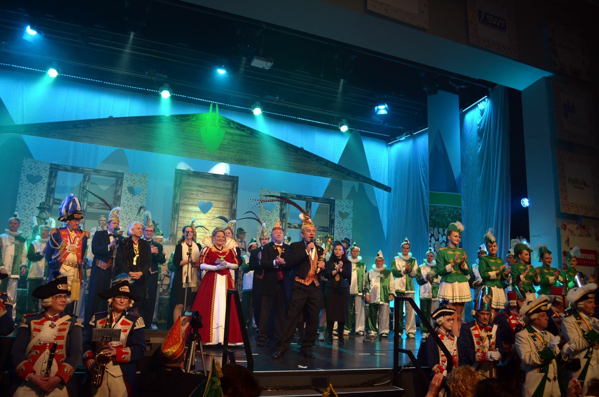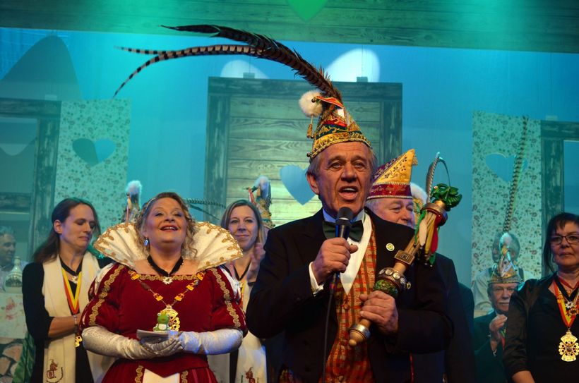 Rund 600 Gäste kamen am Samstag, 11. Februar, zur ersten Sitzung in die Europahalle. In die Bütt begaben sich Gerhard Kress als "Dienstmann", Andrea Ley und Marika Leonardy als "Korrespondentin" und "luxemburgische Bauersfrau", KG-Präsident Harald Reusch als "Orologe/Gebirgsforscher", Rainer Lübeck als "Almbauer", Alexander Houben als "Wichshännschen" sowie Helmut Leiendecker als "Bergsteiger". Der Heuschreckchor nahm gleich mit mehreren Liedern die Trierer Haushaltspolitik aufs Korn. Als Protagonisten hatten sich dabei unter anderem der ehemalige Intendant des Trierer Stadttheaters, "Karl Sibelius", eingeschlichen, der anschließend von Donald Trump als Finanzberater abgelöst wurde. Da war der Schuldenberg aber bereits auf "Eintausendmillionen Euro" angewachsen.