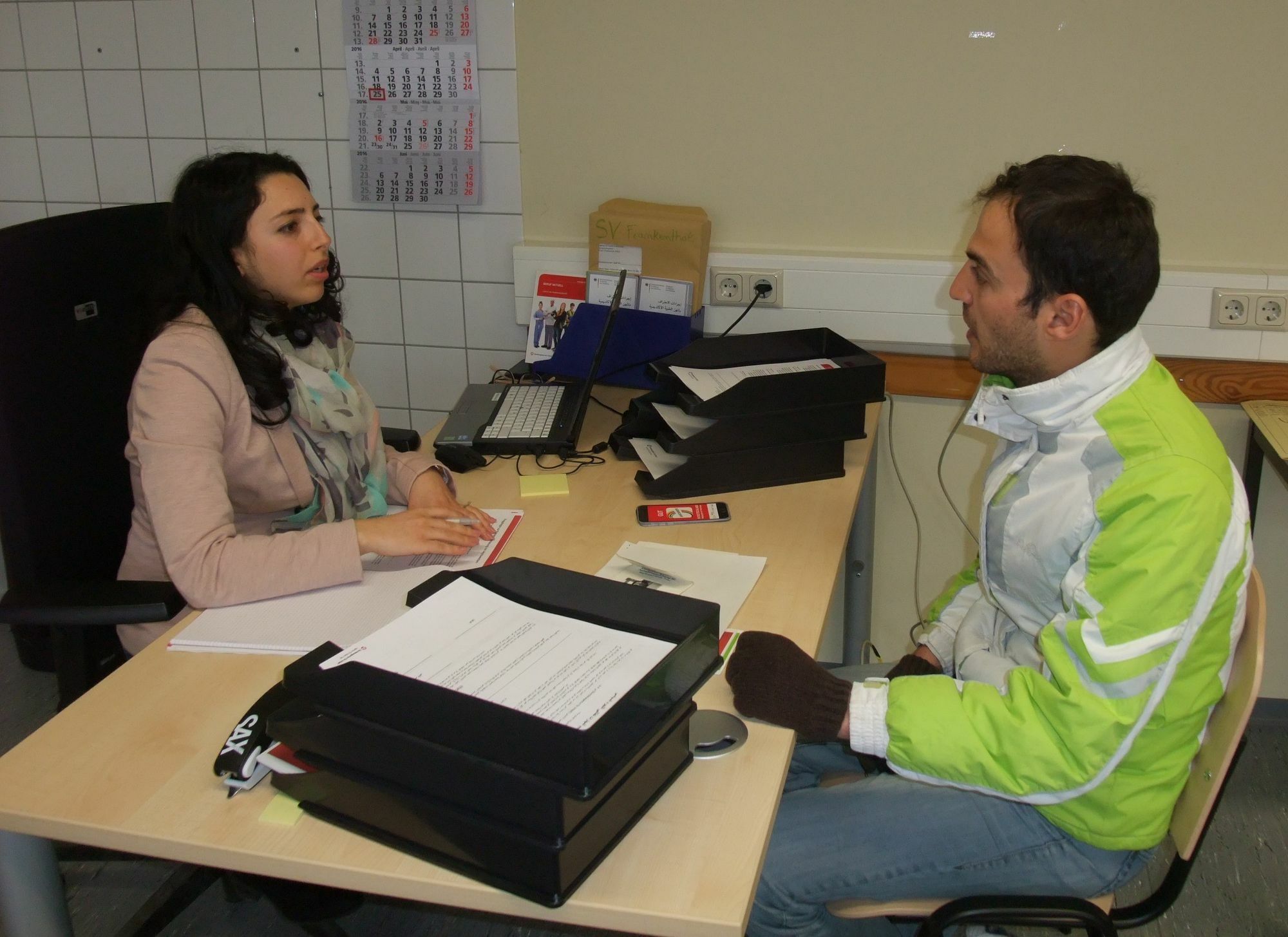 Die Hermeskeiler Unterkunft besteht seit Ende 2015: Seit dem 12. April hält die Arbeitsagentur dort dreimal wöchentlich Informationsvorträge ab. Aber auch die individuellen Beratungsgespräche kommen bei den Bewohnern gut an. Fast 50 Personen haben bisher daran teilgenommen und mit den Arbeitsmigrationsberatern über ihre berufliche Zukunft gesprochen. Bevor jedoch konkrete Maßnahmen anstehen, seien viele Flüchtlinge in erster Linie um ganz grundlegende Informationen über das deutsche Arbeits- und Ausbildungssystem dankbar, weiß die Arbeitsmigrationsberaterin. Deshalb teilt sie gemeinsam mit ihren Kollegen Informationsblätter mit wichtigen Internetadressen und Kontaktdaten verschiedener Einrichtungen aus. "In den Gesprächen geht es zunächst einmal darum, den Menschen Orientierung zu geben", erklärt Dounia El Harim-Gahtow. Oft spiele die Frage nach der Verwertbarkeit ausländischer Abschlüsse eine große Rolle.