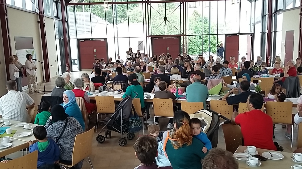 Die herzliche Begrüßung auf deutsch, englisch und arabisch sorgte dafür, dass sich schnell alle wohlfühlten und das Gespräch miteinander suchten. Die extra eingerichtete Kinderbetreuung sorgte für viel Spaß bei Klein und Groß. Und im Hintergrund lief die bestens organisierte Versorgung so vieler Menschen mit Kaffee, Tee, Bergen von Kuchen, aber auch ausländischen Spezialitäten reibungslos bis zum Aufräumen am Schluss, bei dem auch viele Flüchtlinge spontan mit anpackten. Von vielen dankbaren und begeisterten Rückmeldungen beflügelt hofft das Netzwerk noch im Herbst zu einem weiteren Treffen dieser Art einladen zu können, zusätzlich zu den Angeboten wie Willkommen, Begleitung, Fahrdiensten, Materialbeschaffung und bald auch Sprachkurs, die der Helferkreis schon jetzt leistet. Wer noch mitmachen möchte kann sich gerne mit Andreas Flämig unter E-Mail Flaemig.Andreas@caritas-region-trier.de in Verbindung zu setzen. Das Netzwerk bedankt sich nochmals für die Bereitstellung der Räumlichkeiten bei Ortsbürgermeister Werner Olk , und die Geldspende überreicht durch den 1. Beigeordneten Lothar Zengerling und bei allen Helfern, Spendern und Besuchern die zum Erfolg dieses Nachmittags beigetragen haben.