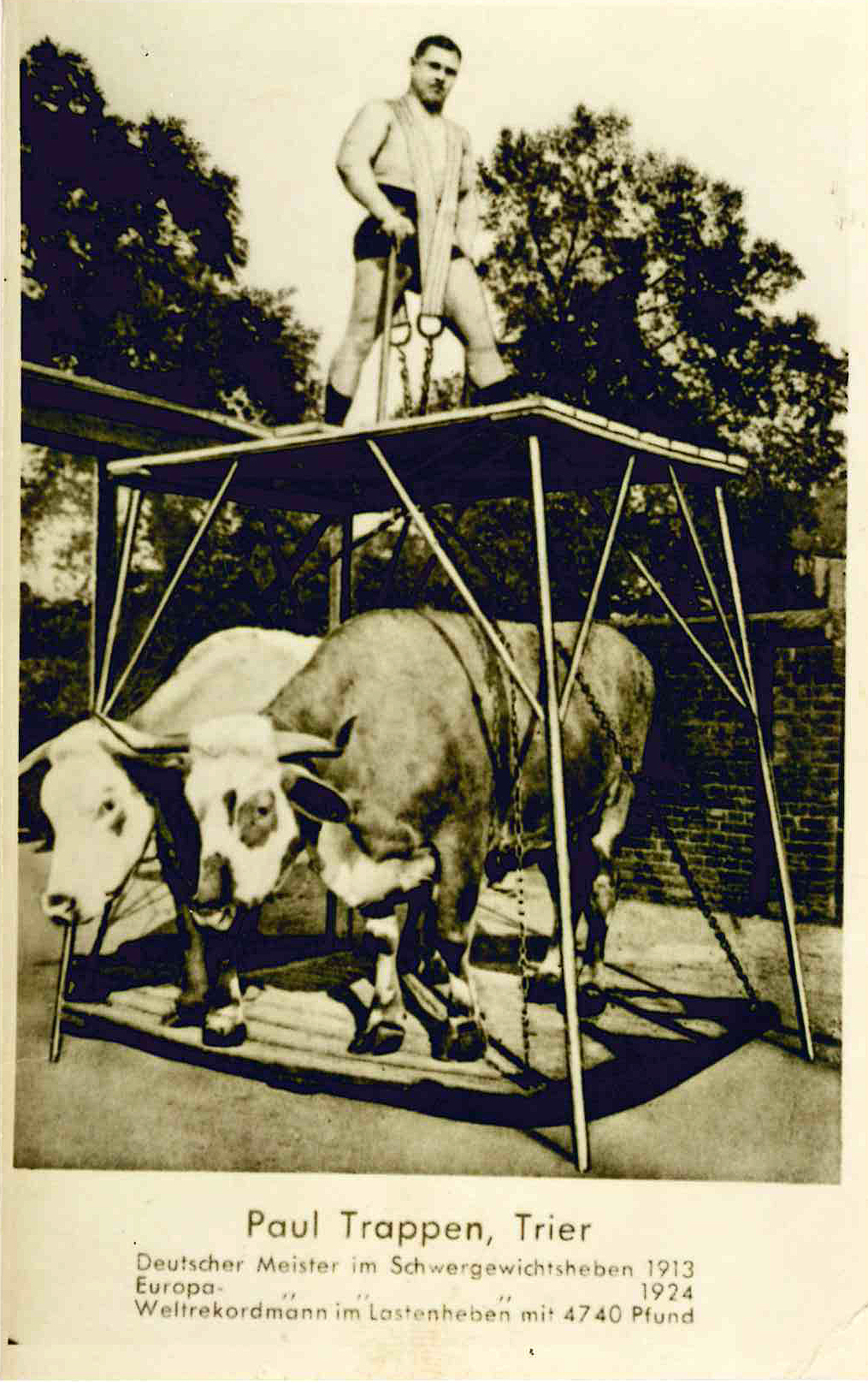 "Trappens Paul" wurde 1887 im Eifelort Heidweiler geboren. Als Metzgerlehrling zog er nach Trier und blieb bis zu seinem Tod Einwohner der Moselstadt. Sein Ruhm gründete auf schier unglaublicher Muskelkraft. Die beiden eingangs erwähnten Ochsen brachten es auf ein Gewicht von 4.128 Pfund. Paul Trappen konnte aber noch mehr heben: ganze Autos zum Beispiel oder 32 Mann – 4.740 Pfund, Weltrekord!