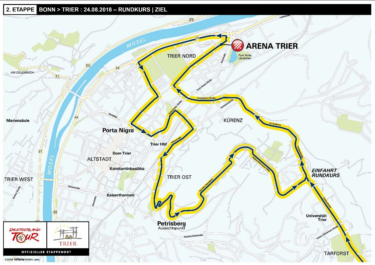Nach der ersten Zielpassage auf der Herzogenbuscher Straße in Höhe der Arena Trier steht mit einer Bergwertung am Petrisberg noch ein Hindernis auf dem Plan. Den tollen Ausblick auf Trier können die Profis allerdings nicht genießen, denn dieser zwei Kilometer lange Anstieg wartet mit drei Serpentinen und einer Steigung zwischen 7 und 10 Prozent auf. Auf dem Berg treffen die Profis wieder auf den Kurs, den sie bereits von der ersten Befahrung der Zielrunde kennen. Von der Kohlenstraße geht es hinab Richtung Zielgerade in der Herzogenbuscher Straße zur Arena Trier, wo der Sieger der 2. Etappe der Deutschland Tour gekürt wird.