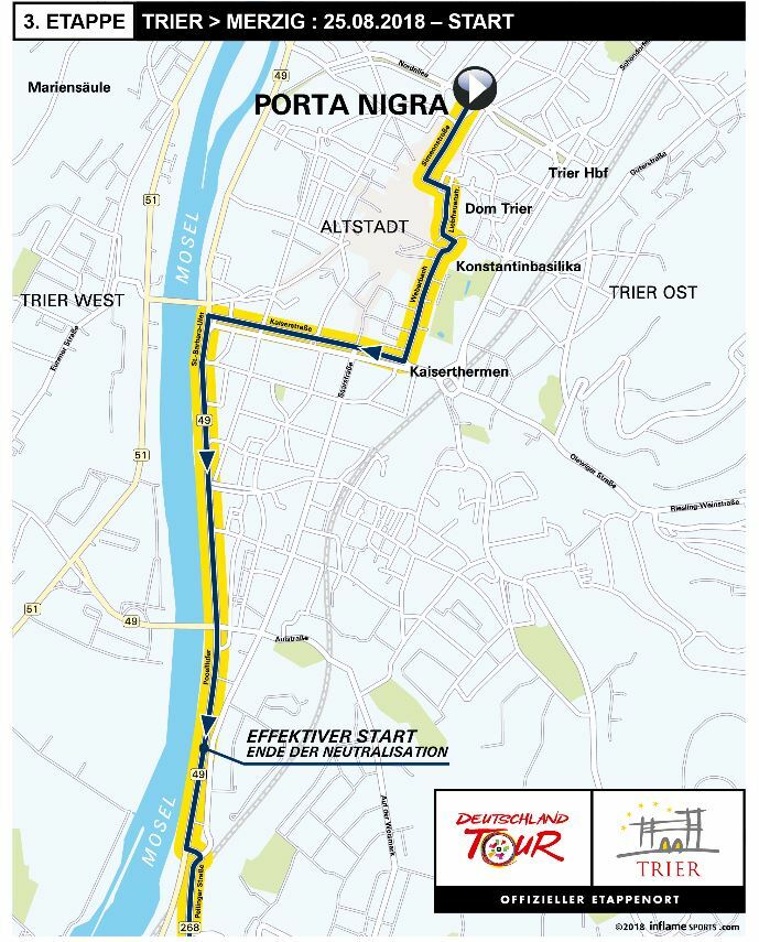 Der Samstag beginnt für die Fahrer in Trier vor der eindrucksvollen Kulisse der Porta Nigra. Durch die Fußgängerzone über den Hauptmarkt und den Domfreihof fährt das Peloton auf rund vier Kilometern neutralisiert durch die Trierer Innenstadt bis zur Mosel. Der scharfe Start zur 3. Etappe der Deutschland Tour 2018 erfolgt auf der B51 in Höhe der Pellinger Straße.