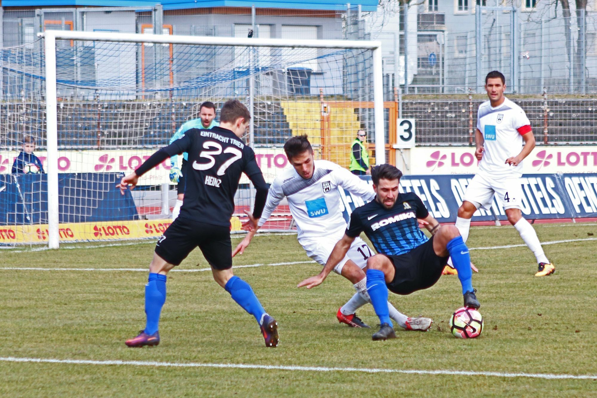 Es wurde vor 1541 Zuschauern von Beginn an das befürchtete Kampfspiel für die Moselstädter, die dem Tabellensechsten aus Baden-Württemberg vor allem in den Zweikämpfen ordentlich Paroli boten. Erst nach einer halben Stunde gelang es der Eintracht dann, im entscheidenden Moment den Nadelstich zum 1:0 zu setzen. Nach einem Eckball war es zunächst Petros Kaminiotis, der auf Muhamed Alawie (32.) verlängerte, welcher sich nicht lange bitten ließ und zur Führung einnickte. Es war bereits der 13. Treffer des Trierer Stürmers in der laufenden Spielzeit.