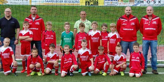 In neuem Outfit präsentieren sich unsere F2-Junioren. Bestens für die kommende Saison, als dann F1-Junioren, ausgestattet mit neuen Trikots, gesponsert von der Fa. Britten.it aus Irsch und mit Aufwärmpullis gesponsert von C. Russo (Hotel am Markt), Fiede Weishaar (Saarflotte.de) und N.Puschmann (Puschis Bratparadies) können die Jungs ihr Können unter Beweis stellen.