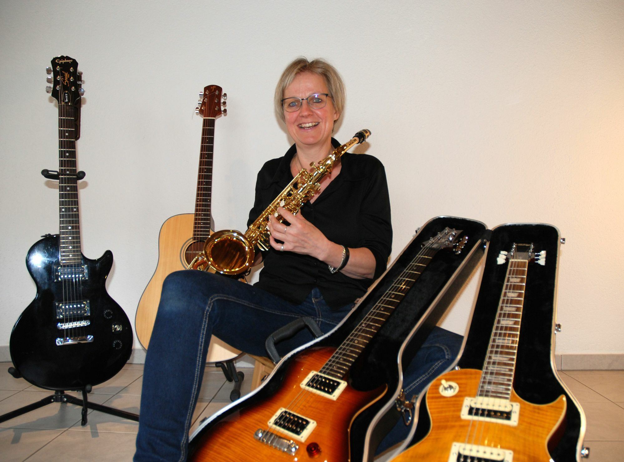 Gitarren waren Fred Schröders Leidenschaft. Im Namen ihres verstorbenen Mannes setzt sich Anne Schröder nun dafür ein, Kindern, die es sich nicht leisten können, eine musikalische Ausbildung zu ermöglichen. Sie selbst hat am Saxophon entdeckt, wie viel Kraft Musik geben kann. Fotos: Schönhofen