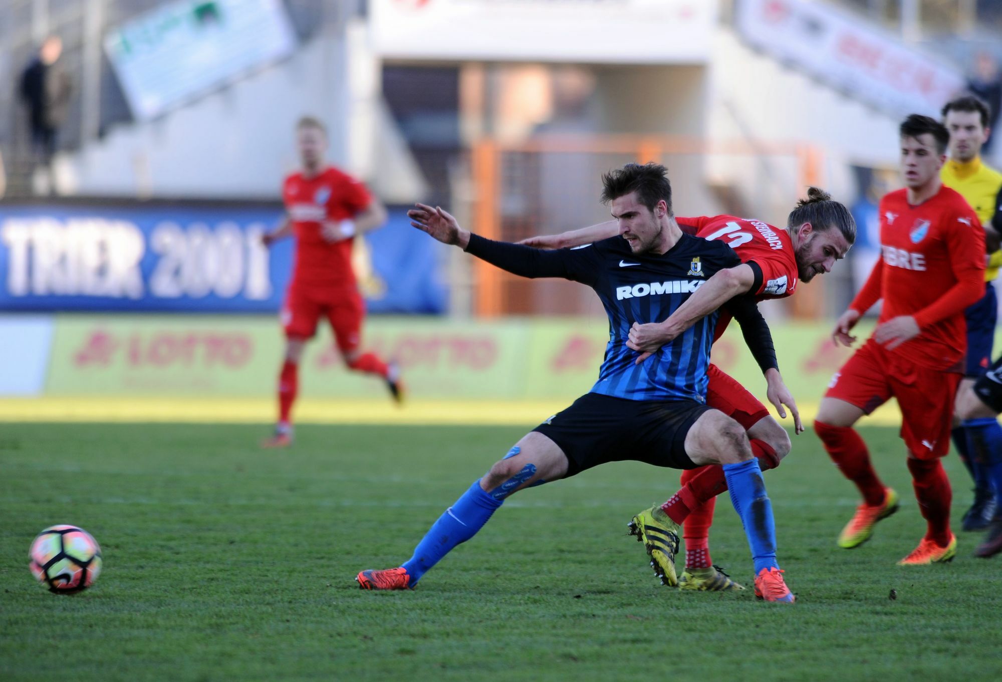 Die Hausherren kamen nach zwei Absagen hintereinander (das Heimspiel gegen den 1. FC Kaiserslautern II wird am Dienstag, 6. Dezember, 19 Uhr, nachgeholt, für das Match in Homburg gibt es noch keinen neuen Termin) besser in das Spiel. Die große Chance zur Führung bot sich in der 21. Minute: Nach einer Kombination über Christoph Anton und Kevin Heinz kam Sebastian Szimayer in der Mitte einen Tick zu spät. Mehr und mehr setzte sich derweil die bessere Spielstruktur der Steinbacher durch, die indes vor dem Seitenwechsel meist nur durch Schüsse aus der zweiten Reihe (Maurice Müller, Sargis Adamyan, Sasa Strujic) einigermaßen gefährlich wurden. Im letzten Drittel fehlte es der Mink-Elf zunächst noch an Entschlossenheit. Das sollte sich in der zweiten Hälfte ändern. Schon vier Minuten vor dem 0:1 schob Adamyan den Ball frei vor Keilmann am Trierer Tor vorbei (53.). Nach dem Rückstand war der SVE phasenweise von der Rolle. Das Comeback von Kapitän Michael Dingels ("Wir kämpfen und probieren vieles, momentan mangelt es aber auch an Qualität.") nach monatelanger Verletzungspause weckte aber nochmal Kräfte bei den insgesamt angeschlagen wirkenden Eintrachtlern: Eine weite Flanke erwischte Robin Garnier am langen Pfosten per Kopf, Mirko Schuster kratzte das Spielgerät indes noch von der Linie (74.).