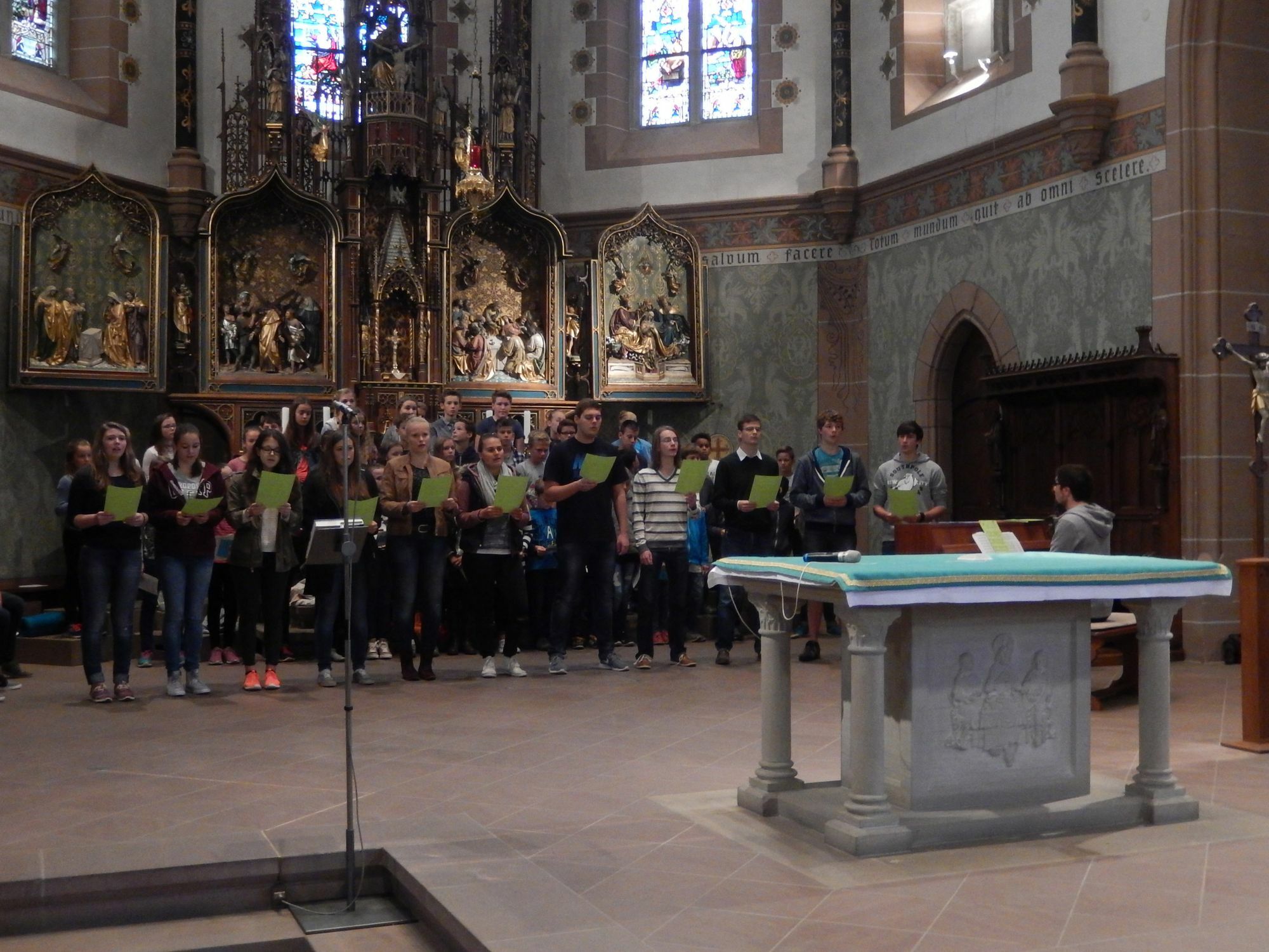 Am Ende des Gottesdienstes wurden dann alle neuen Schüler des Gymnasiums auf die Bühne gebeten, auf der sie von ihren Patenklassen eine "Krone" überreicht bekamen, damit sie in den kommenden aufregenden Wochen an der neuen Schule immer daran erinnert werden, "aufzustehen, die Krone zu richten und weiterzugehen". Entsprechend folgte zum Ende des Gottesdienstes auch die musikalische Aufforderung des Chores der sechsten Jahrgangsstufe: "Geh mit neuer Freude, geh mit neuer Kraft!" Im Anschluss ging es dann für alle zurück zur Schule, wo die neuen Fünftklässler in ihre neuen Klassen eingeteilt wurden und bei Spielen die Gelegenheit hatten, sich und ihre neuen Klassenleitungsteams kennenzulernen. Unterdessen bekamen ihre Eltern in der Mensa bei einem Stehempfang noch zahlreiche Informationen; außerdem hatten sie die Möglichkeit, die Schule bei einem Rundgang kennenzulernen.