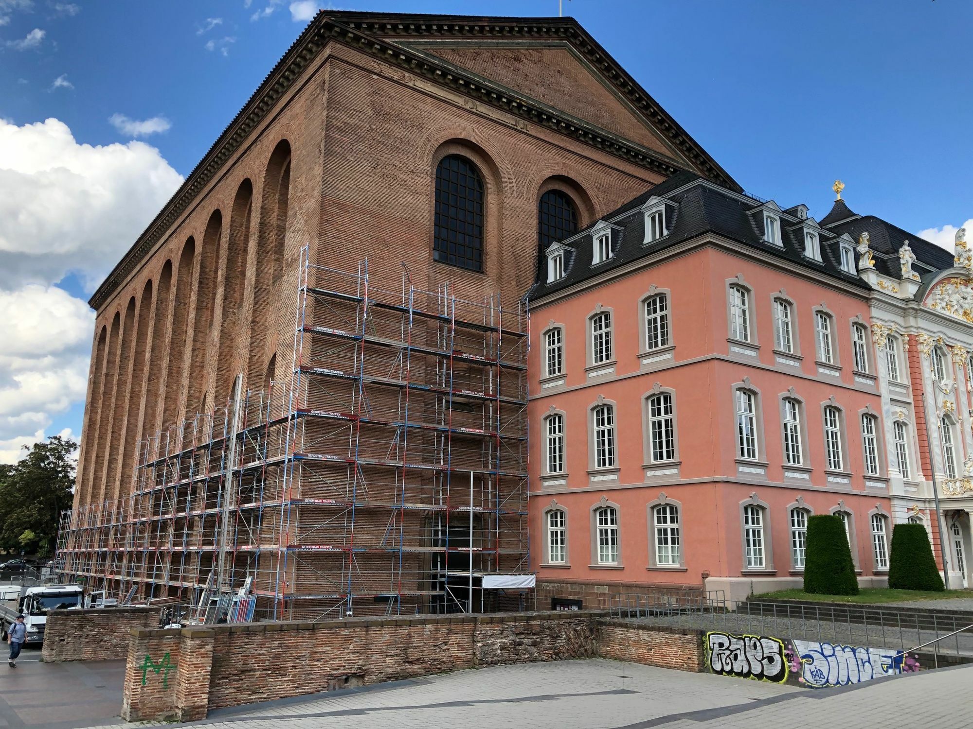 Auf dem Dach der Konstantin-Basilika wird derzeit ein Seilsicherungssystem montiert. Dieses soll die Handwerker bei Dacharbeiten in mehr als 30 Metern Höhe schützen. Die zum UNESCO-Weltkulturerbe zählende Kirche ist deshalb momentan von einem Baugerüst umgeben.