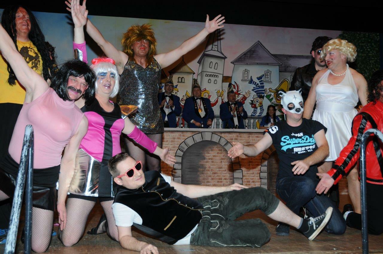 Schon gleich nach dem gigantischen Einmarsch der Hermeskeiler Garden und des Elferrates sprang der Funken auf die Narrenschar über, die bis Mitternacht ein Feuerwerk der guten Laune erleben durften. Als Mönche eines geheimen Ordens verkleidet, entfachte das Männerballett (Trainerin: Birgit Haag) auch dieses Jahr wieder ein Blitzlichtgewitter. Nach und nach schälten sich die Rock- und Popstars aus ihren Kutten und ließen das Stimmungsbarometer kurz vor dem großen Finale ganz nach oben schlagen.