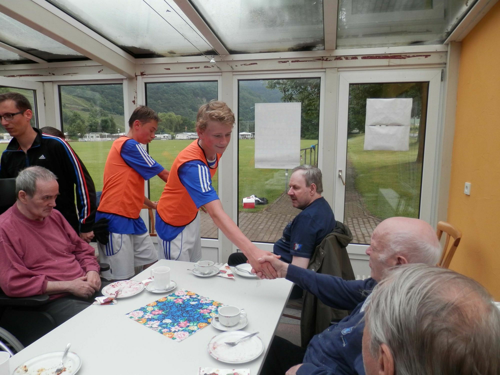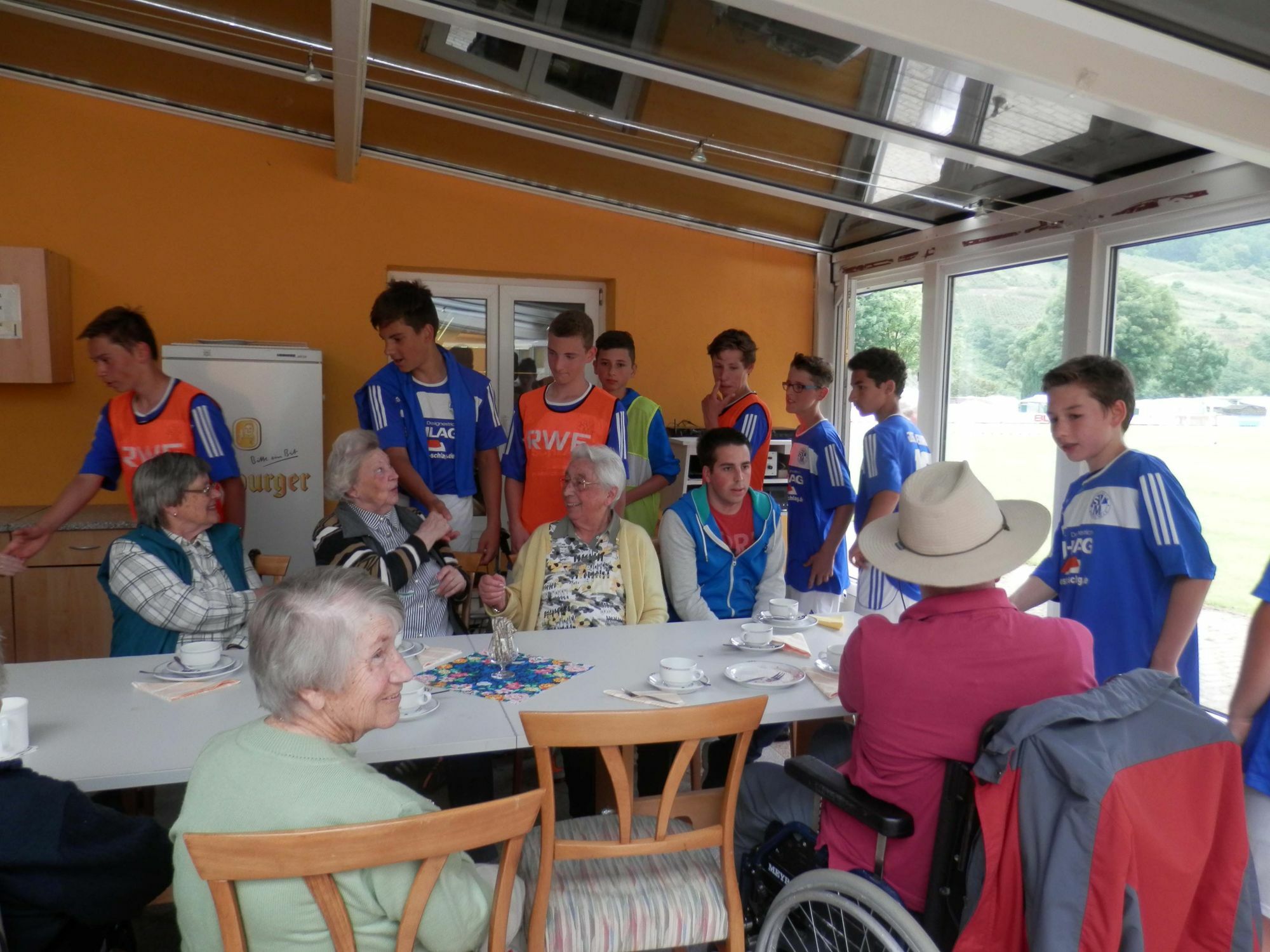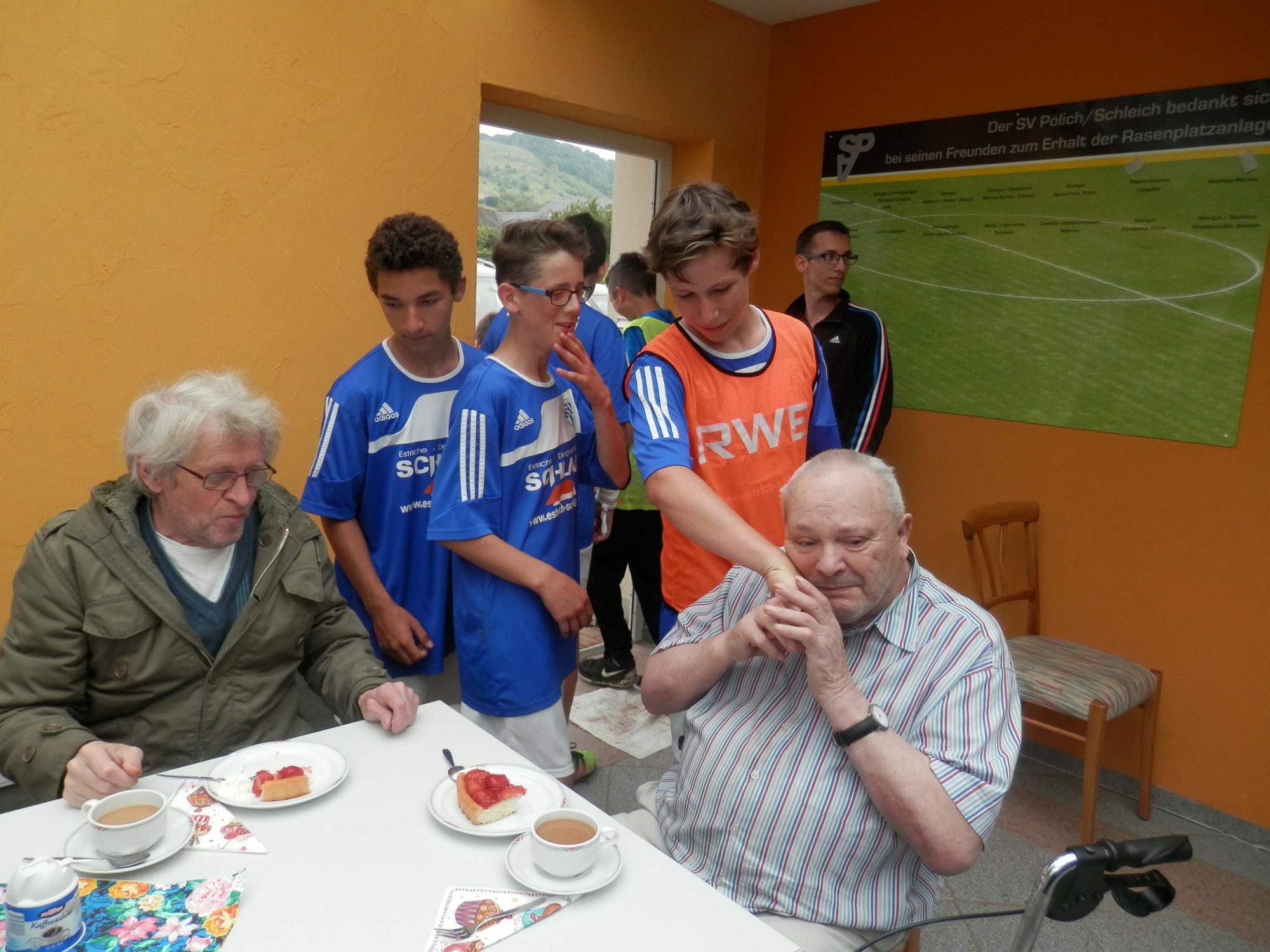 Die U15-Junioren der Jugendfußallspielgemeinschaft Mehring/Leiwen begrüßten am Samstag, 11. Mai, die Bewohner der Seniorenresidenz St.Andreas in Pölich zu ihrem Fußballspiel. Im bis auf den letzten Platz besetzen Pölicher Vereinsheim warteten die gut gelaunten Senioren auf den Anstoß des Spiels. Charmant wurden sie mit Kaffee und natürlich dem von den Eltern der Spieler mit viel Liebe selbst gebackenen Kuchen versorgt.