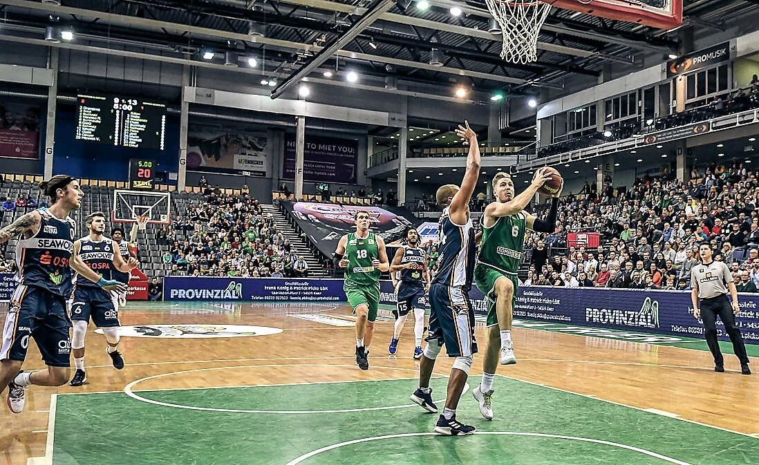 Im Schlussviertel dann der erste Run für Trier: Erst Till Gloger an der Freiwurflinie, dann Rupert Hennen per Korbleger zum 57:52. Rostock ließ sich aber weiterhin nicht abschütteln. 59:55, noch sieben Minuten. Dann Licht und Schatten bei Jordan Geist: Erst erkämpfte er das 61:55 durch den Treffer trotz enger Verteidigung von Martin Bogdanov, um dann – im Zurücklaufen – das Unsportliche Foul für eine Auseinandersetzung mit Bogdanov zu kassieren. Auszeit Trier und dann zwei Freiwürfe plus Ballbesitz für die Gäste aus Rostock. Daraus konnten die Seawolves jedoch nur einen Punkt generieren und nach einem Tip In von Bucknor zum 63:56 wurde Arena erstmals wieder richtig laut. Mitch Jost kümmerte das wenig, sein Dreier zum 63:59 rauschte durch die Maschen und sorgte wieder für etwas Ruhe. Das Spiel am Samstagabend blieb weiterhin ein echter Krimi. Für Trier war es jetzt einmal mehr Till Gloger, der zuverlässig für Punkte sorgte. Bei Rostock traf der hoch gehandelte Malik Pope einen wichtigen Dreier, der seine Farben weiter im Spiel hielt. 67:64 nach Punkten von Gloger. Noch 3:06 Minuten, Auszeit Milan Skobalj, Rostock Seawolves. Beide Teams hatten nun die Mannschaftsfoul-Grenze überschritten, so dass die Partie auch an der Freiwurflinie hin und her ging. Kalidou Diouf konnte zum 68:67 für Rostock anschließen, in der folgenden Sequenz verabschiedete sich Kyle Dranginis per Offensivfoul: es war das fünfte Foul gegen den Trierer Guard. Im nächsten Angriff dann Bogdanov auf Diouf, Korbleger 68:69 für Rostock. Noch 1:47 Minuten, Auszeit Trier. Den Gladiators gelang es nicht, jetzt zu treffen, Rostock legte über den schlaksigen Grant Sitton nach: 68:71, erneut Auszeit Trier. Noch 1:02 Minuten. Aber auch im folgenden Angriff fand der Dreierversuch von Jermaine Bucknor nicht das Ziel. Dann Offensivfoul Rostock durch den starken Martin Bogdanov und dadurch ein weiterer Angriff für die Gladiatoren. Aber auch der Dreierversuch von Jordan Geist verfehlte den Korb weit. Die Gäste aus Rostock spielten die Partie jetzt clever zu Ende und siegten 68:73.