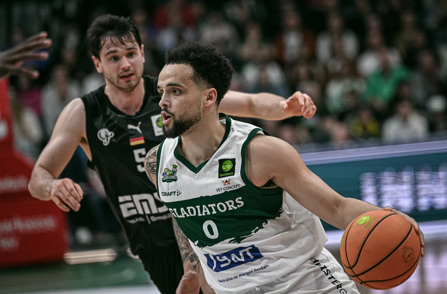 Gegen die Nürnberg Falcons betraten Jordan Barnes, Behnam Yakhchali, JJ Mann, Moritz Krimmer und Maik Zirbes das Parkett der SWT Arena als Starting Five der RÖMERSTROM Gladiators Trier. Es entwickelte sich eine zerfahrene Anfangsphase, in der beide Teams mit Unkonzentriertheiten im Spielaufbau und daraus resultierenden Ballverlusten zu kämpfen hatten. Dennoch gelang es den Gladiatoren den Rebound zu kontrollieren und sich durch cleveres Einsetzen der Big Men einen Vorsprung von 13:6 zur Mitte des ersten Viertels herauszuspielen. Mit fortlaufender Spieluhr wurden die Gastgeber vor allem aus der Distanz treffsicherer und Evans Rapieque sorgte mit zwei erfolgreichen Dreiern am Stück für die erste zweistellige Trierer Führung (25:15, 8. Spielminute). Ein kleiner Lauf der Falcons sorgte dann für den 25:20 Viertelstand nach den ersten zehn Minuten.