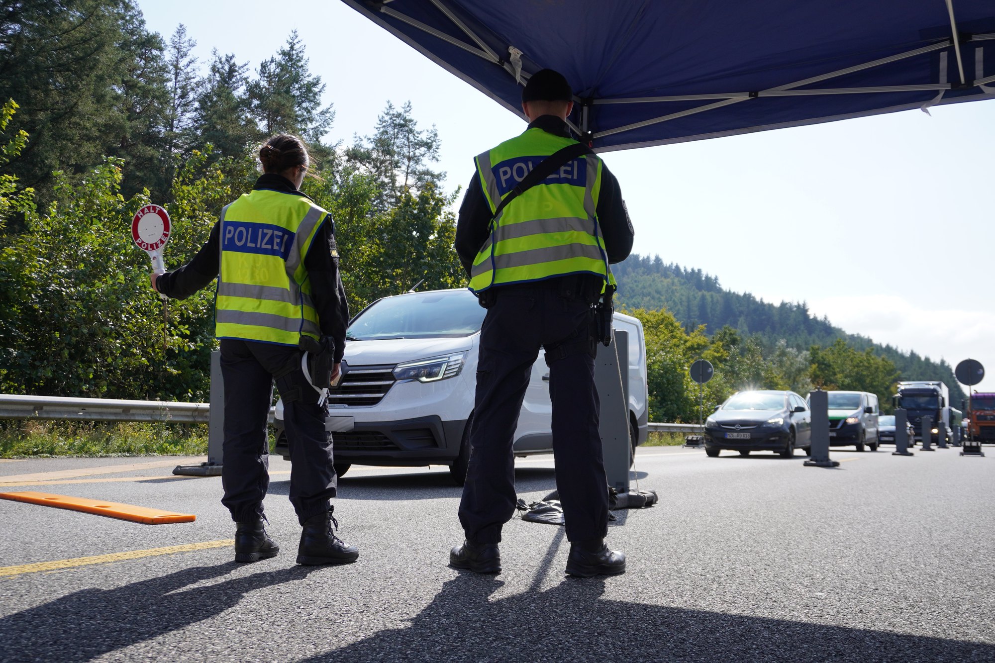 Der Verkehr wird von 80 km/h auf 20 km/h zum langsam fahren aufgefordert. Kurz vor der Kontrolle wird es dann einspurig, auf der Durchfahrt der Kontrollstelle sind Barrieren zum langsam fahren auf der Straße errichtet worden. Zwei Bundespolizeikräfte stehen in einem Zelt mit der Anhalte Kelle und der Schutzausrüstung.