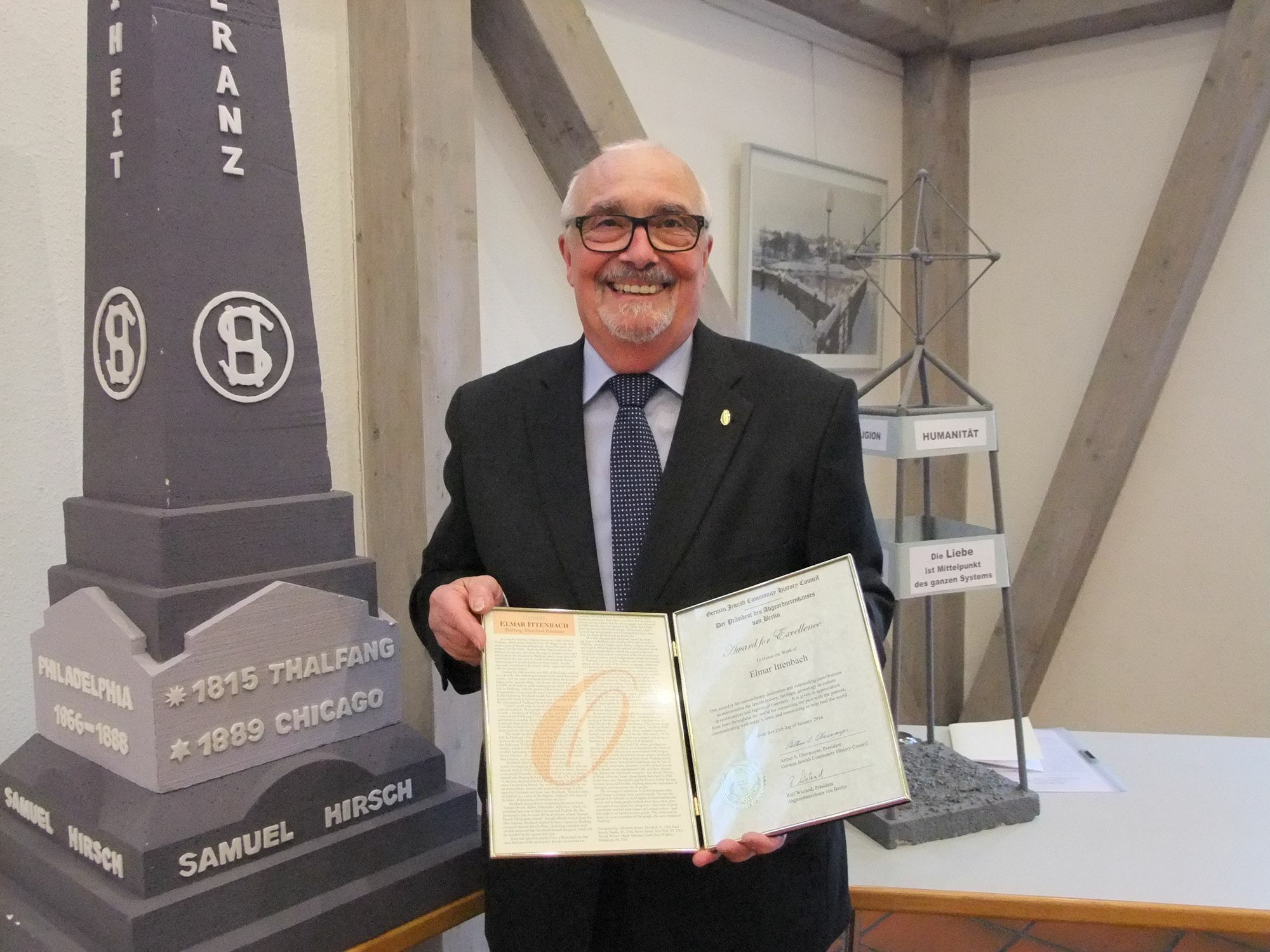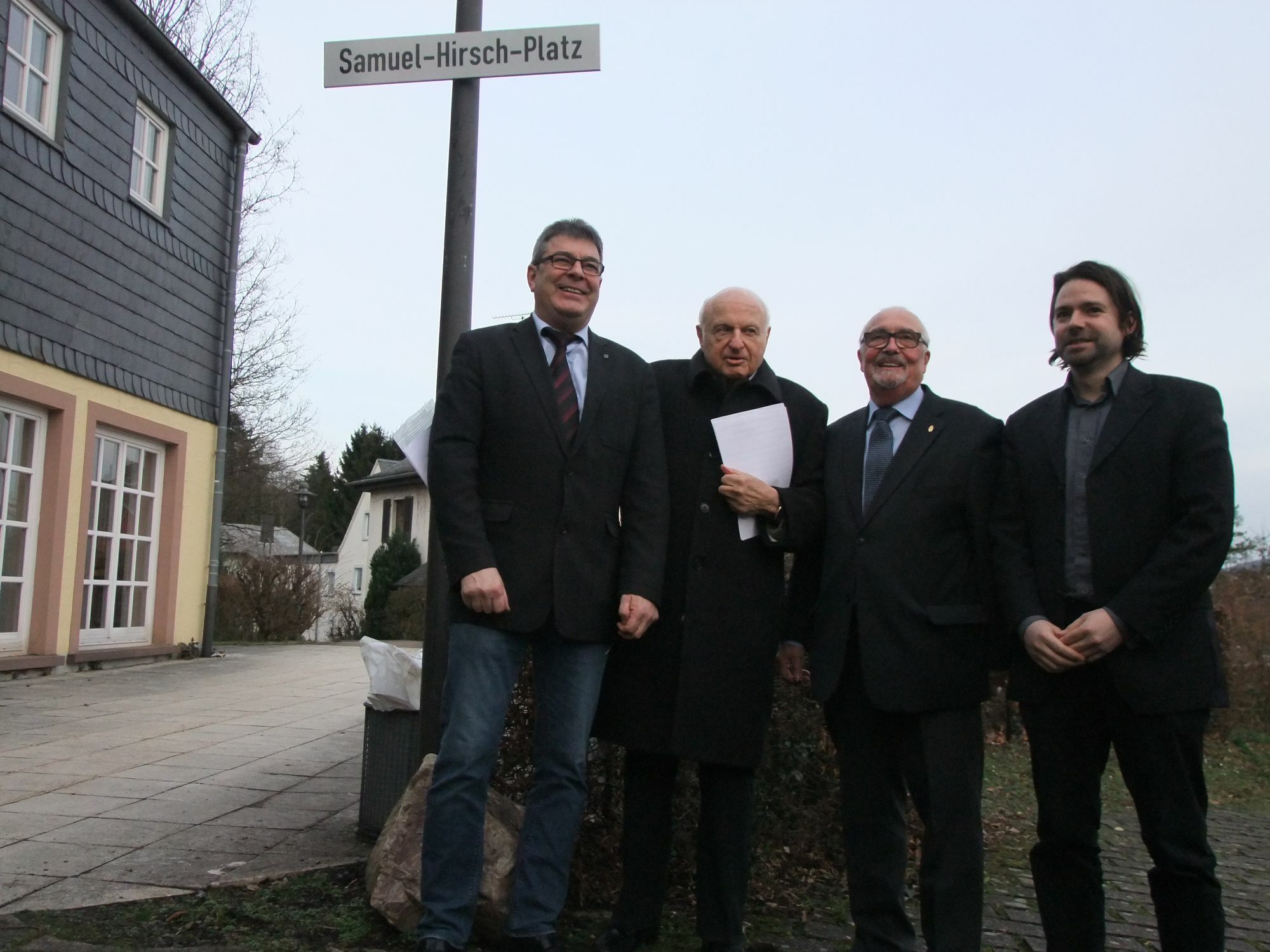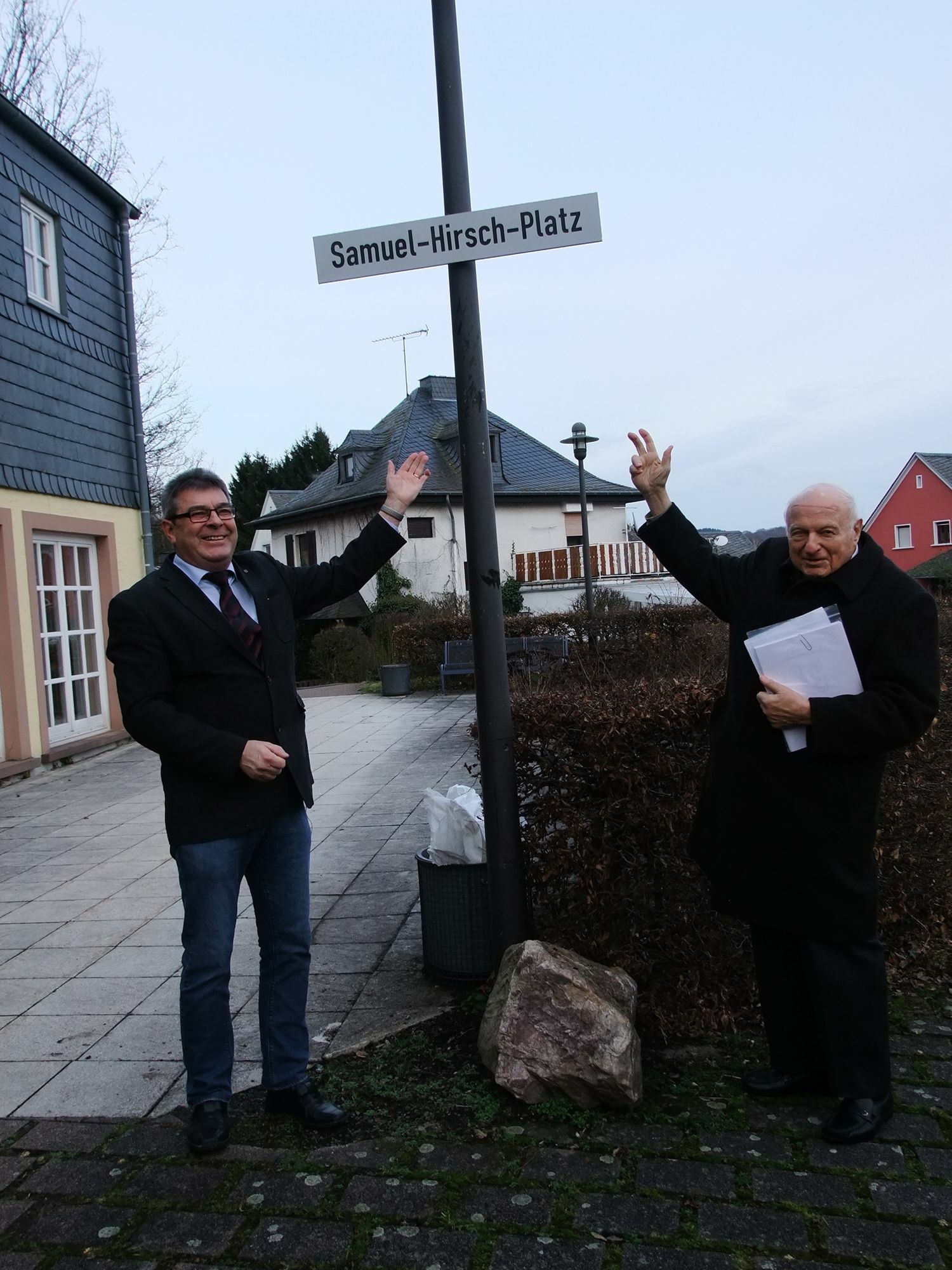 »Es fühlt sich an, als würde man nach Hause kommen«, sagte Emil Gustav Hirsch aus Florida (USA) anläasslich der feierlichen Einweihung des Platzes, der seinem berühmten Urgroßvater Samuel Hirsch gewidmet ist. Es war das erste Mal, dass der fast 90-Jährige gemeinsam mit seinem Sohn den Ort besuchte, in dem sein Urgroßvater vor über 200 Jahren geboren wurde. Darüber weiß in Thalfang und Umgebung niemand mehr als der ehemalige Religionslehrer Elmar Ittenbach, durch den dieser Besuch erst möglich wurde. »Für Samuel Hirsch waren Toleranz, Freiheit und Humanität die Kriterien der Religion der Zukunft«, sagte Ittenbach. Diese religiöse Toleranz habe Hirsch als Kind in Thalfang als etwas Selbstverständliches kennengelernt. Neben dem neuen Namen sei auch noch ein Nachdenkmal, wie Ortsbürgermeister Burkhard Graul ausdrücklich betonte, geplant. Dazu seien Mittel aus einem EU-Förderprogramm beantragt worden. Eine Sitzmöglichkeit soll das Ensemble dann abrunden, einen Platz zum Nachdenken schaffen. "Die Gemeinde ist sehr stolz auf ihren berühmten Sohn. Der Platz wertet nicht nur den Ort, sondern auch die Thalfanger auf", so Burkhard Graul bei der Enthüllung des neuen Schildes. Denkmal in Anlehnung an den Grabstein von Samuel Hirsch in Chicago Wie das Denkmal aussehen wird, zeigte Elmar Ittenbach anhand eines von ihm gebauten Modells. Es veranschaulicht das, was für Samuel Hirsch wichtig war: Die Religion der Liebe und der Toleranz war für Hirsch die Religion der Zukunft. Neben den Begriffen Toleranz, Freiheit, Religion und Humanität soll das geplante Denkmal auch die Lebensdaten sowie die Stationen seines Wirkens tragen. Wenige Tage zuvor war der Thalfanger Elmar Ittenbach mit dem German-Jewish-History Award für die Aufarbeitung der Geschichte der Thalfanger Familie Hirsch ausgezeichnet worden. Es ist maßgeblich sein Verdienst, dass dieser neue Gedenkplatz üüberhaupt zustande kommen konnte, lobte Burkhard Graul Ittenbachs Arbeit. So groß wie Samuel Hirschs Grabmal auf dem Friedhof in Chicago wird das Gegenstück in Thalfang allerdings nicht. Auch die Schüler der Realschule plus in Thalfang haben sich mit der jüdischen Geschichte beschäftigt und dabei das Grabmal aus Chicago nachgebaut. Die Freude war natürlich sehr groß, dass nun der Urenkel von Samuel Hirsch, Emil Gustav Hirsch, sie im Unterricht besucht. Schulleiterin Sabine Becker sagte: "Es war schon sehr ergreifend, mit den jungen Menschen über die Geschichte zu sprechen." Sie sei stolz darauf, den Urenkel von Samuel Hirsch kennengelernt zu haben. Ein kalter Winter und warmherzige Menschen Für Emil Hirsch war es sehr berührend, zu sehen, wie die Thalfanger das Andenken an seine Familie am Leben erhalten. Abschließend sagte er: »Das war ein bedeutender Tag für die jüdische und für die deutsche Kultur, die miteinander verbunden sind. Am Samstag fliegen wir nach Florida zurück, wo es viel wärmer ist – mit der Erinnerung an einen kalten Winter, aber sehr warmherzige Menschen in Deutschland. FIS