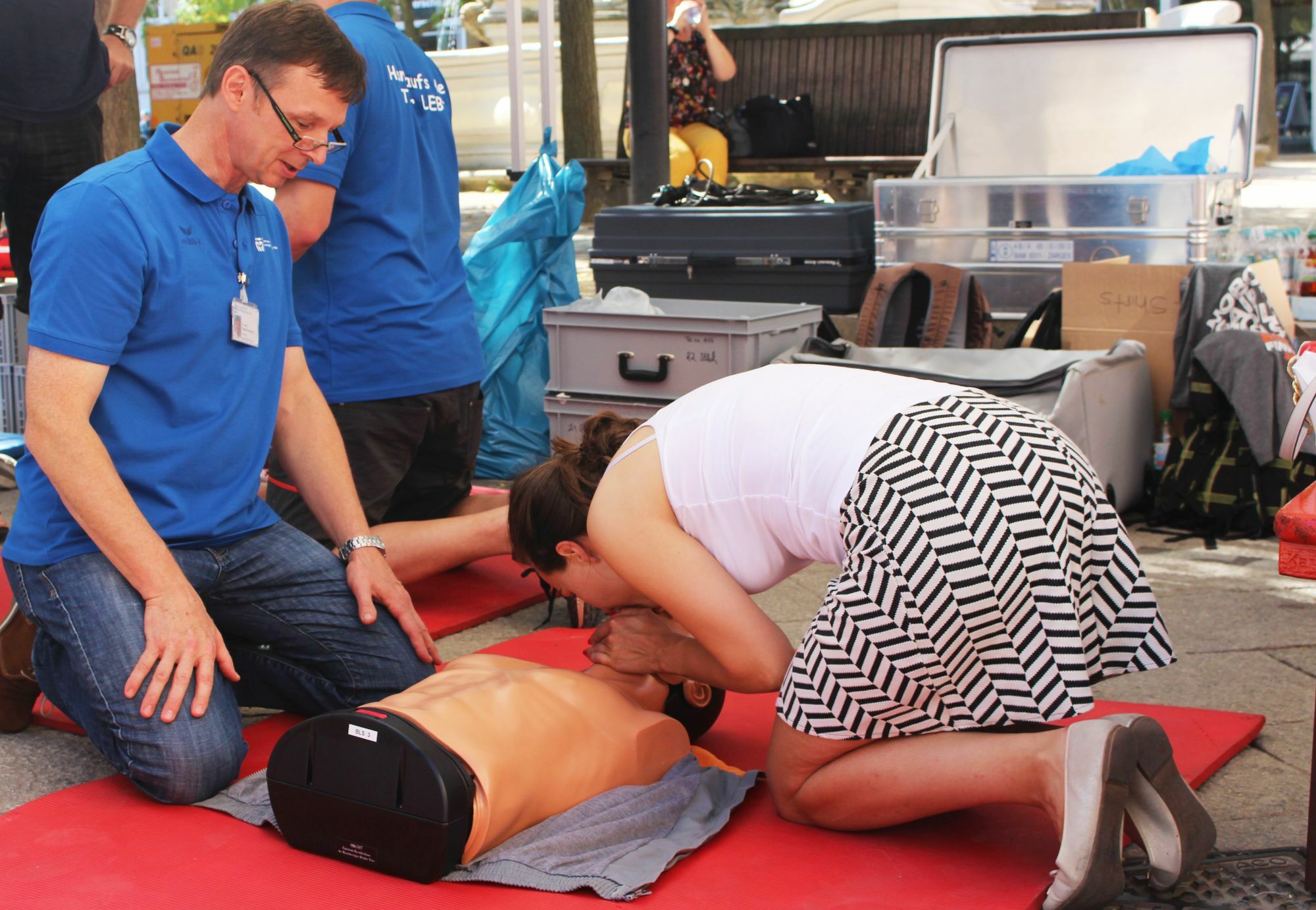 Zehn Jahre liegt Vyara Minkovas erster und bislang letzter Erste-Hilfe-Kurs zurück. "Damals habe ich den Führerschein gemacht", erzählt die junge Frau und berichtet, dass sie schon einiges vergessen habe und vollkommen aus der Übung sei. Gut, dass die 29-Jährige vor kurzem über den Kornmarkt spaziert, sich ein Herz fasst und spontan eine Gelegenheit nutzt, die sich nicht alle Tage bietet: eine kostenfreie Schulung in Sachen Laienreanimation.