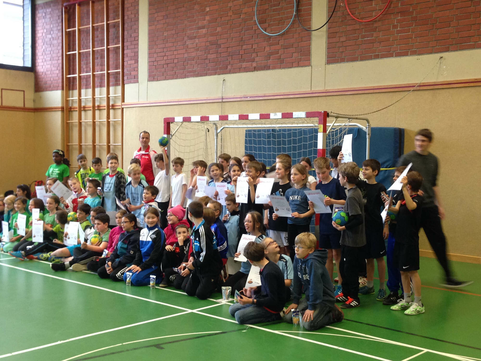 Bei der anschließenden Siegerehrung wurden alle teilnehmenden Kinder mit Urkunden und einem Erfrischungsgetränk belohnt. Für die 3 Erstplatzierten Mannschaften jedes Turniers gab es einen Geldbetrag für die Klassenkasse, welcher von der Sparkasse Trier zur Verfügung gestellt wurde. Der HSC Schweich und auch die teilnehmenden Schulen sind sich einig auch in den nächsten Jahren ein solches Turnier durchführen zu wollen.   Die 3 Erstplatzierten des Turniers der 5 Klassen in der Stefan-Andres-Halle: