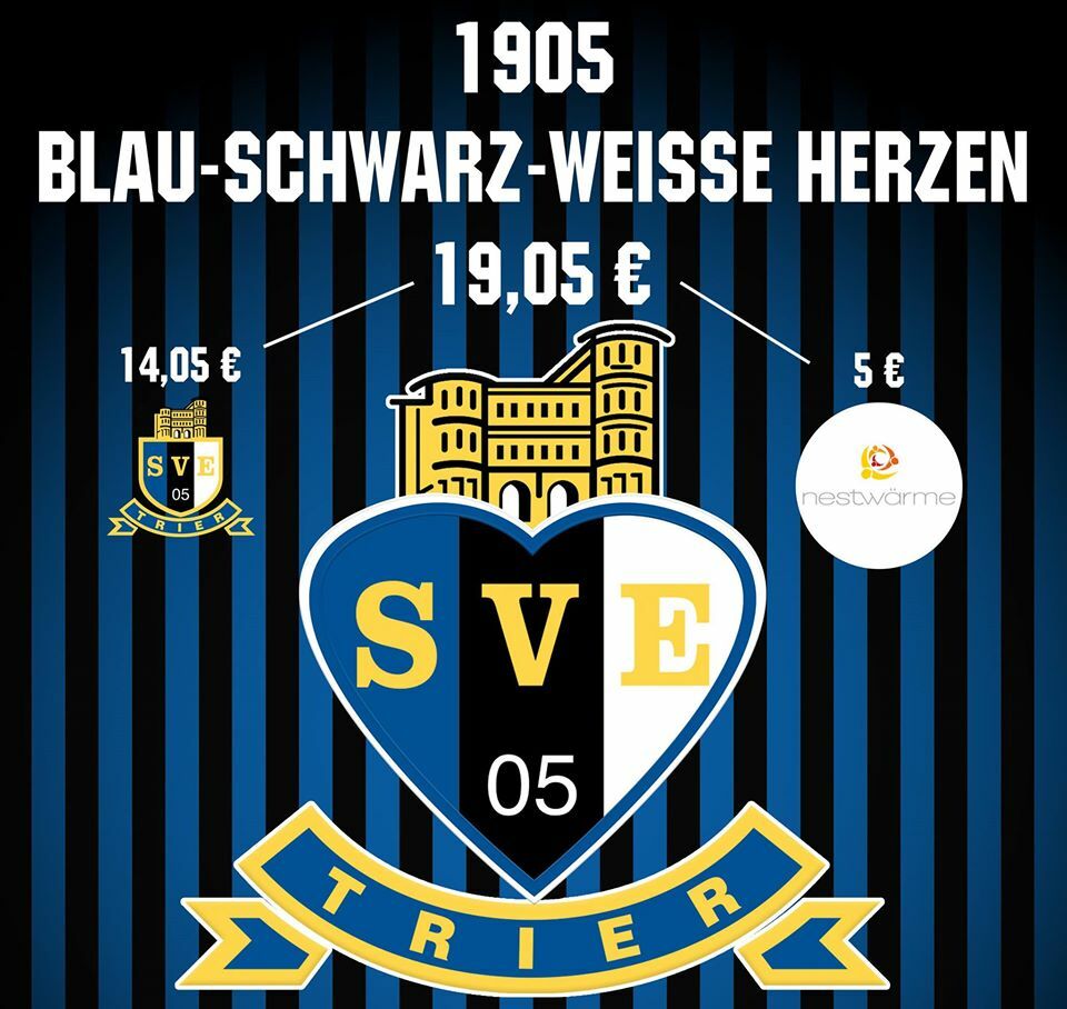 Beim SVE Ticket-Partner Ticket Regional kann man ab sofort Unterstützertickets im Wert von 19,05 Euro erwerben. Von diesen 19,05 Euro gehen immer 5 Euro als Spende an der Verein Nestwärme in Trier. Ziel der Kampagne wird es neben der Unterstützung sein, ein noch leeres blau-schwarz-weiße Herz mit Leben bzw. mit Bildern zu füllen. Jeder Ticketkäufer hat deshalb die Möglichkeit, ein Foto mit seinem ausgedruckten Ticket an den SVE zu senden und dafür ins Herz eingefügt zu werden. Die Kampagne ist abgeschlossen, wenn 1905 Fotos das Herz vollständig bedecken. Über Zwischenstände wird Eintracht-Trier regelmäßig über die offiziellen Kanäle auf dem Laufenden halten.