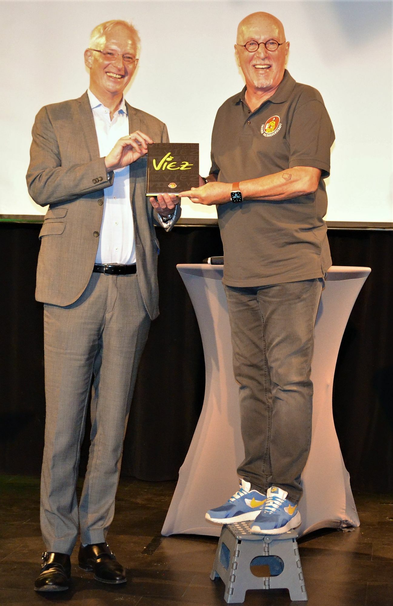Präsident Hanspitt Weiler überreichte im Anschluss Oberbürgermeister Wolfram Leibe - selbst überzeugter Vieztrinker - das erste neue Buch "Viez". Viezbruder Helmut Haag erhielt für sein in Trierer Mundart vorgetragenes Plädoyer für die Porz als Trinkgefäß "Nuren in der Porz schmeckt de Viez so richtich gammer" viel Applaus von der viezkundigen Zuhörerschaft. Passend musikalisch umrahmt wurde die kurzweilige Veranstaltung von Bänkelsänger und Liedermacher Andreas Sittmann und Geigerin Isabell Krohn.