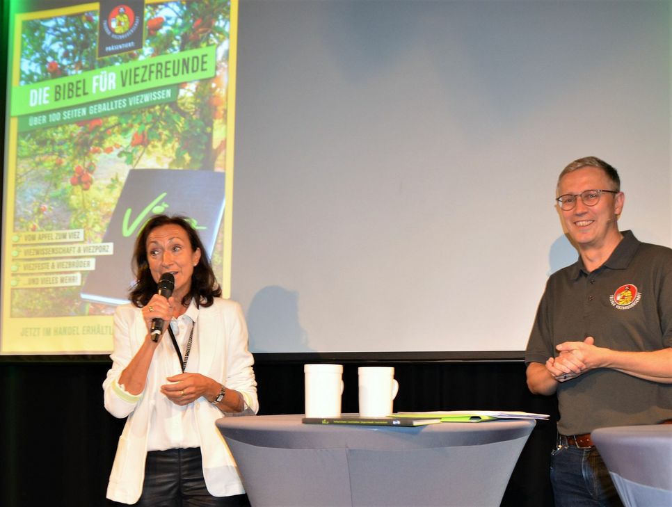 Moderator Michael Schmitz führte gekonnt und launig durch den Abend und stellte in Kurzinterviews mit den Autoren des Buches, Viezproduzenten, Verleger Michael Weyand und Hiltrud Zock als Vertreterin der vom Verkaufserlös begünstigten Kulturstiftung Trier die Inhalte des Buches und die Ziele der Trierer Viezbruderschaft vor.