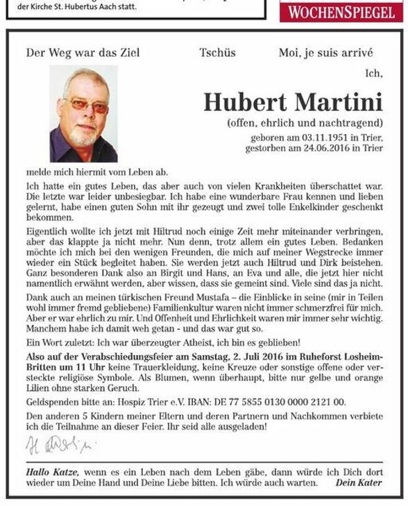 "Offen, ehrlich, nachtragend" - so beschreibt Hubert Martini sich in der Anzeige, die er vor seinem Tod selbst verfasst hat. Und ehrlich scheint der Mann aus Trier gewesen zu sein. Als überzeugter Atheist möchte er auf seiner "Verabschiedungsfeier", dass die Gäste auf "Trauerkleidung, Kreuze oder sonstige offene oder versteckte religiöse Symbole" verzichten. Auch für seine Geschwister findet er deutliche Worte. "Den anderen 5 Kindern meiner Eltern und deren Partnern und Nachkommen verbiete ich die Teilnahme an dieser Feier. Ihr seid alle ausgeladen."